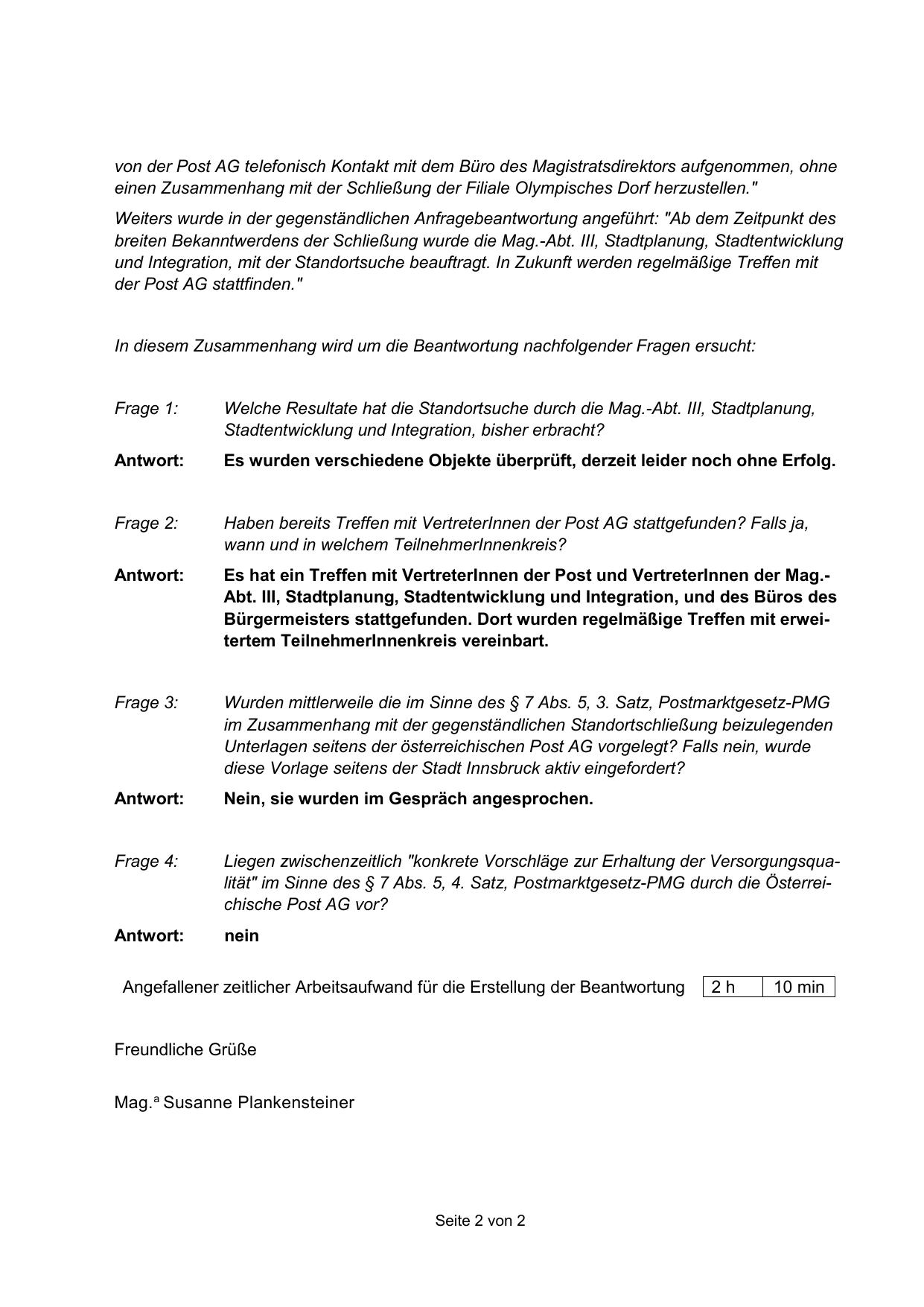 von der Post AG telefonisch Kontakt mit dem Büro des Magistratsdirektors aufgenommen, ohne