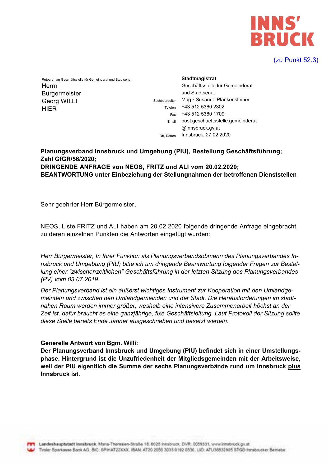 Herr Bürgermeister, In Ihrer Funktion als Planungsverbandsobmann des Planungsverbandes Innsbruck und Umgebung (PIU) bitte ich um dringende Beantwortung folgender Fragen zur Bestellung einer "zwischenzeitlichen" Geschäftsführung in der letzten Sitzung des Planungsverbandes