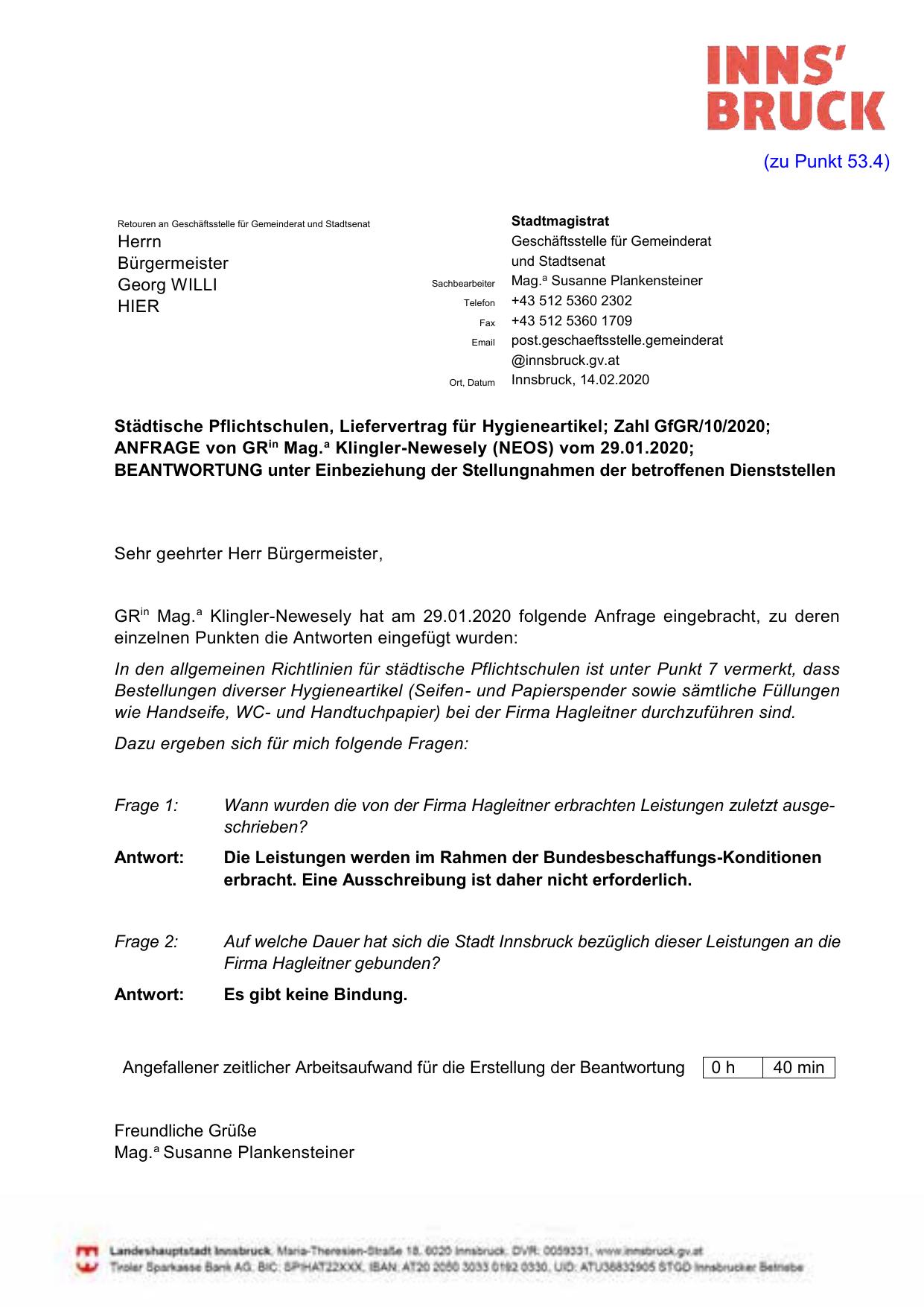 Städtische Pflichtschulen, Liefervertrag für Hygieneartikel; Zahl GfGR/10/2020;