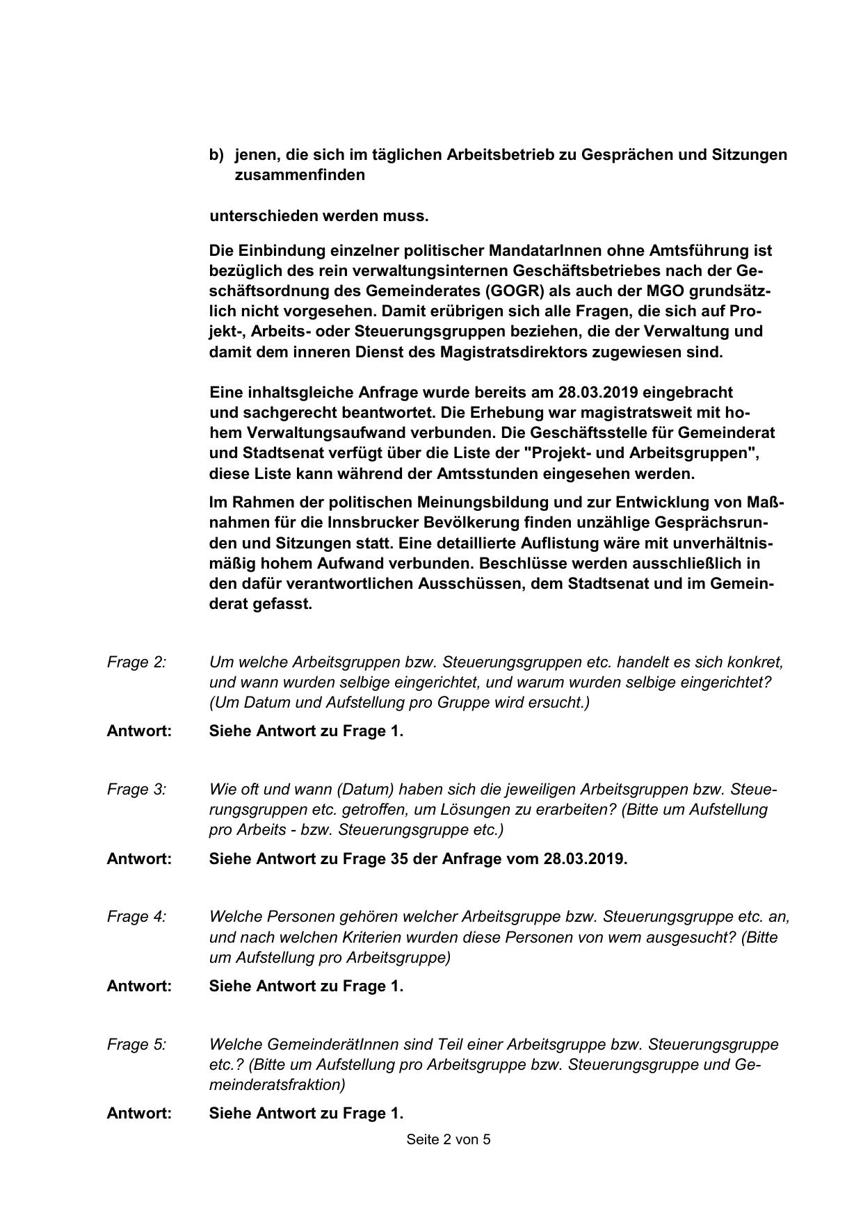 Im Rahmen der politischen Meinungsbildung und zur Entwicklung von Maßnahmen für die Innsbrucker Bevölkerung finden unzählige Gesprächsrunden und Sitzungen statt. Eine detaillierte Auflistung wäre mit unverhältnismäßig hohem Aufwand verbunden. Beschlüsse werden ausschließlich in