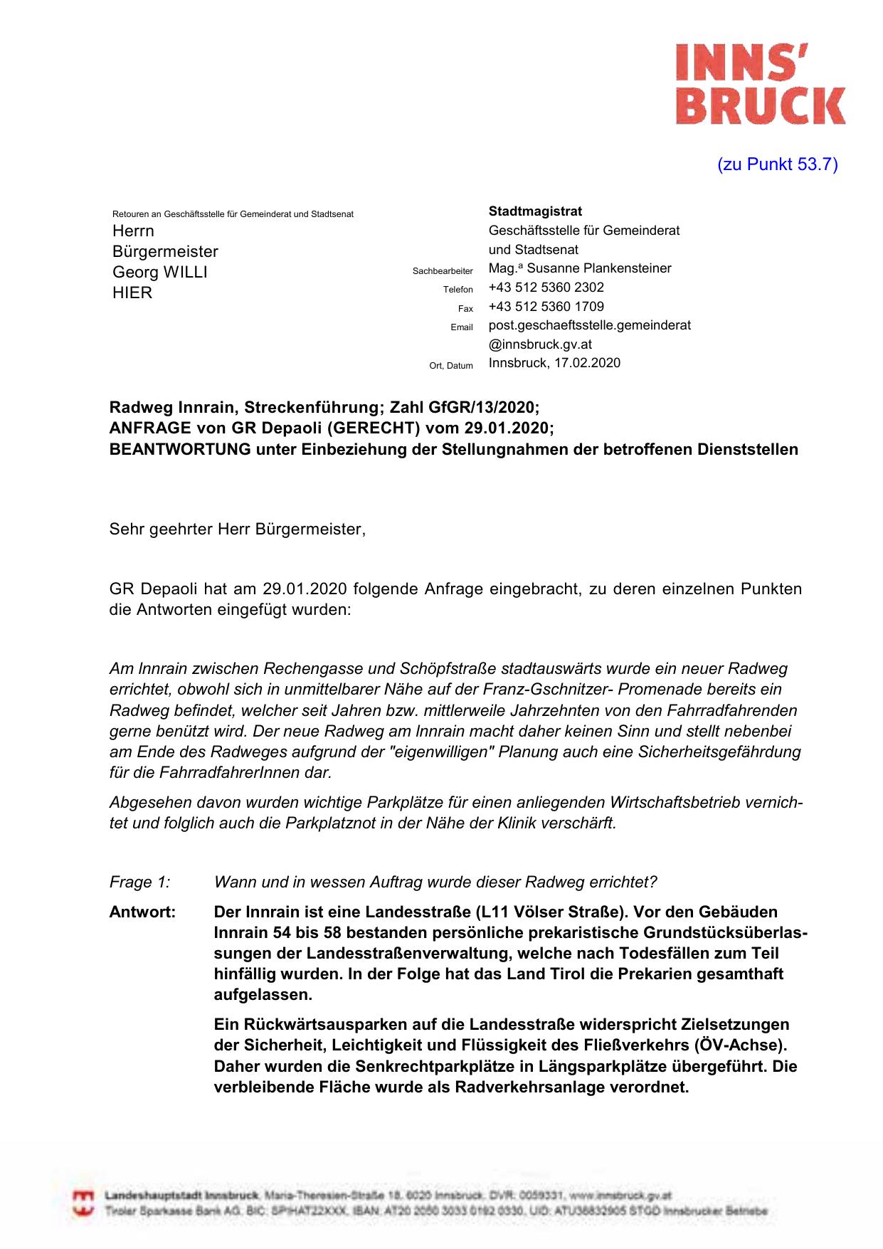 GR Depaoli hat am 29.01.2020 folgende Anfrage eingebracht, zu deren einzelnen Punkten
