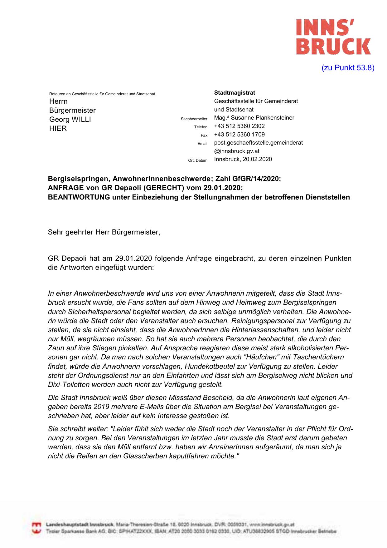 Bergiselspringen, AnwohnerInnenbeschwerde; Zahl GfGR/14/2020;