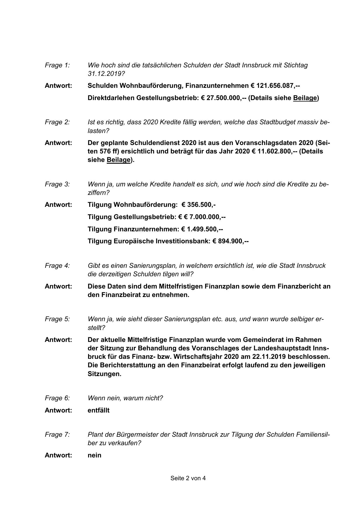 Der geplante Schuldendienst 2020 ist aus den Voranschlagsdaten 2020 (Seiten 576 ff) ersichtlich und beträgt für das Jahr 2020 € 11.602.800,-- (Details