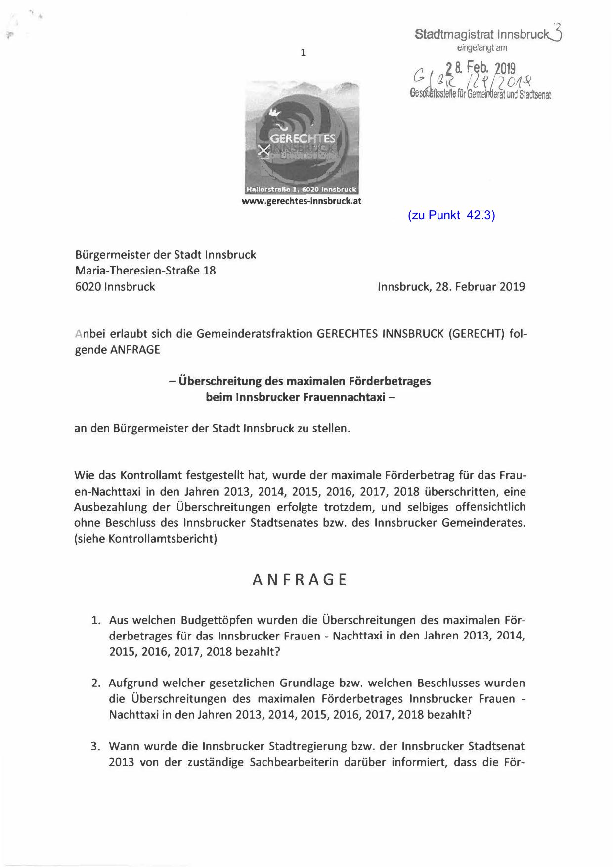 Anbei erlaubt sich die Gemeinderatsfraktion GERECHTES INNSBRUCK (GERECHT) fol