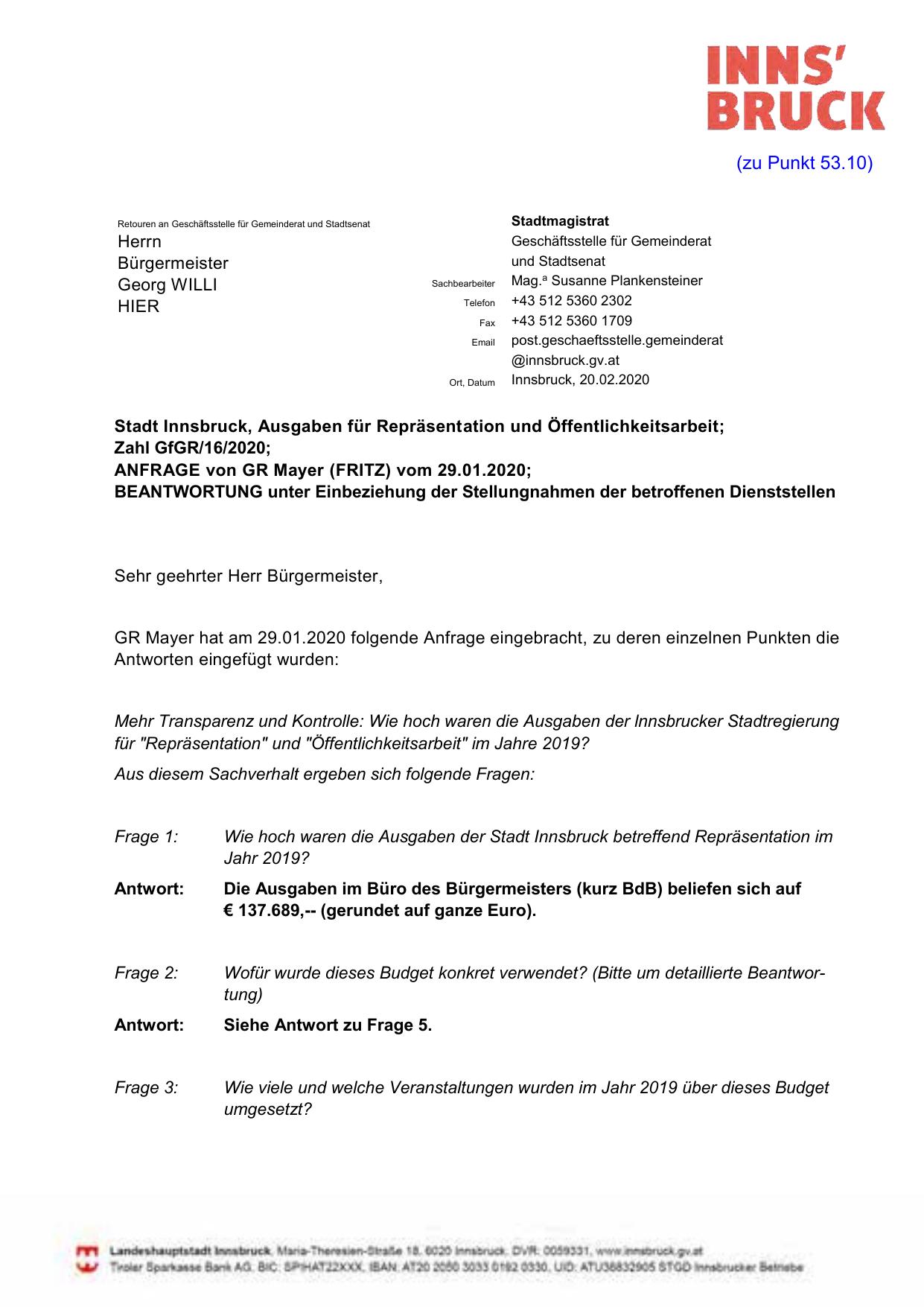 Stadt Innsbruck, Ausgaben für Repräsentation und Öffentlichkeitsarbeit;