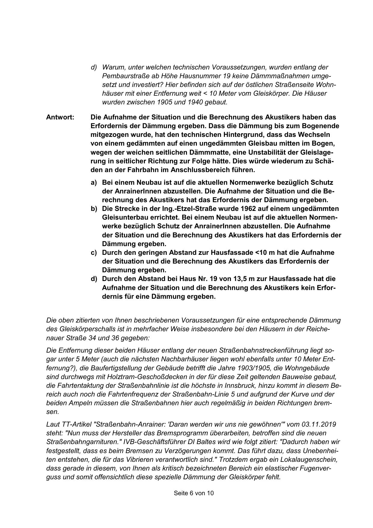 Pembaurstraße ab Höhe Hausnummer 19 keine Dämmmaßnahmen umgesetzt und investiert? Hier befinden sich auf der östlichen Straßenseite Wohnhäuser mit einer Entfernung weit < 10 Meter vom Gleiskörper. Die Häuser