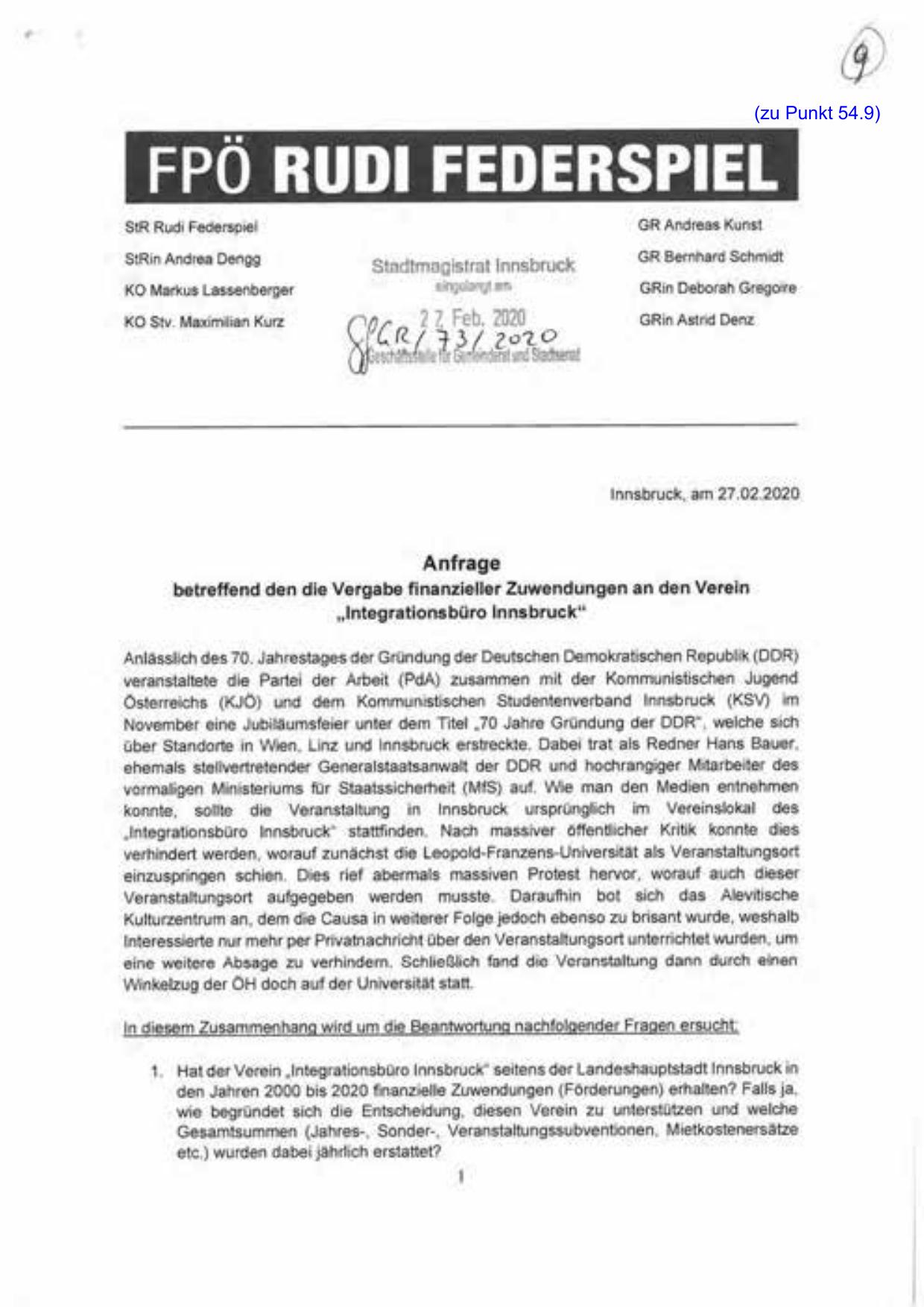 1. Hat der Verein „Integrationsbüro Innsbruck" seitens der Landeshauptstadt Innsbruck in
