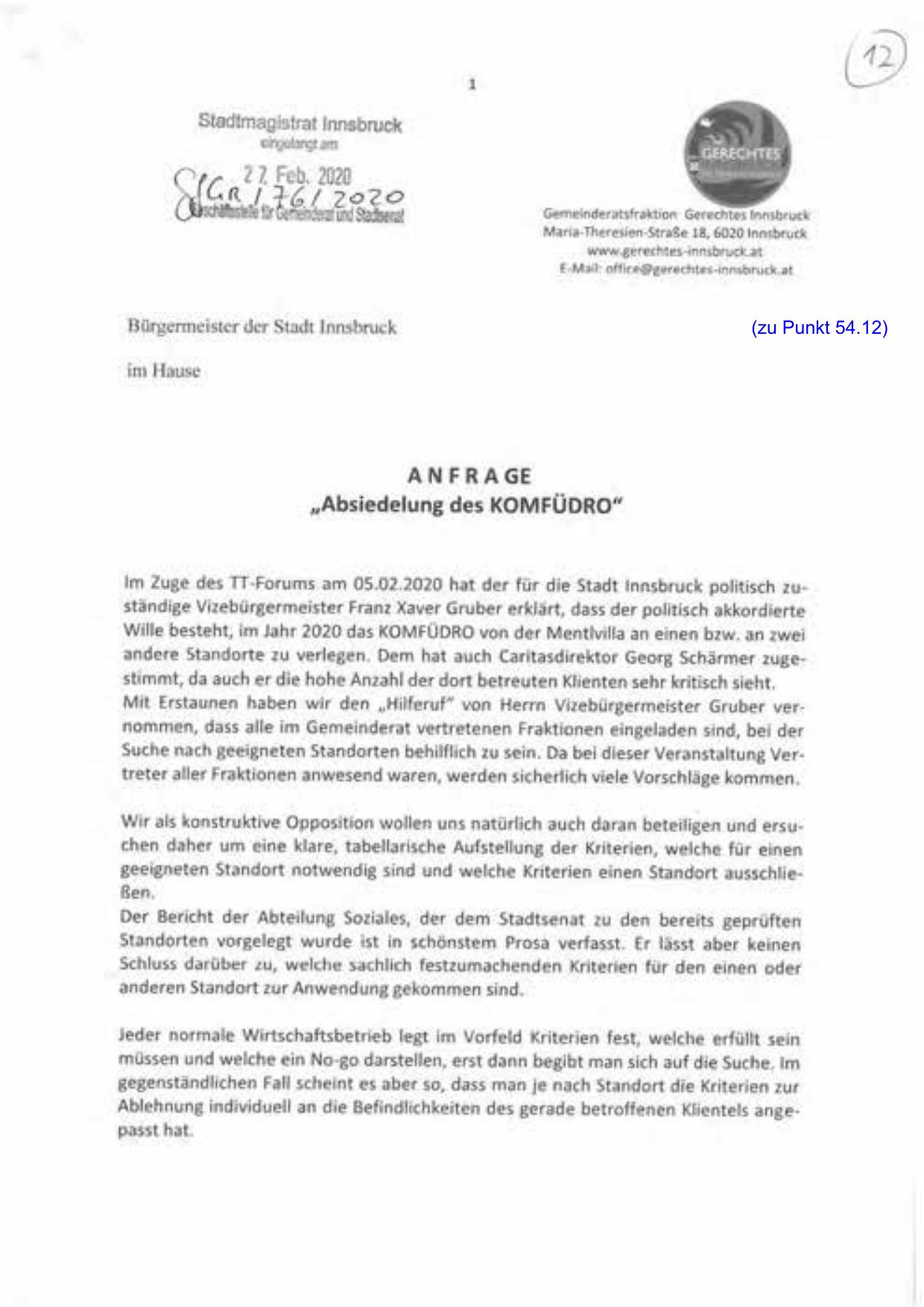 Im Zuge des TI-Forums am 05.02.2020 hat der für die Stadt Innsbruck politisch zuständige Vizebürgermeister Franz Xaver Gruber erklärt, dass der politisch akkordierte