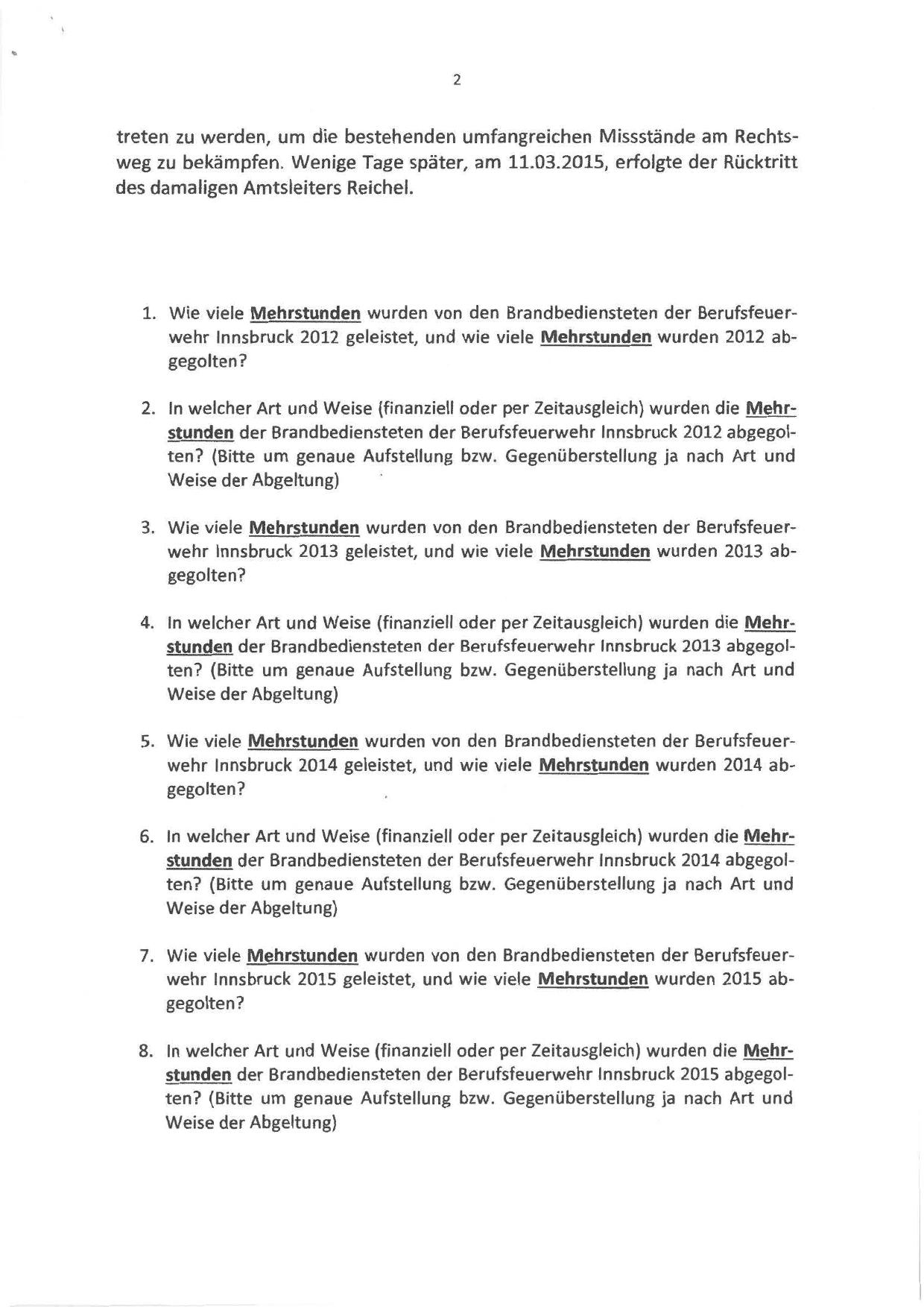 8. In welcher Art und Weise (finanziell oder per Zeitausgleich) wurden die Mehrstunden der Brandbediensteten der Berufsfeuerwehr Innsbruck 2015 abgegolten? (Bitte um genaue Aufstellung bzw. Gegenüberstellung ja nach Art und