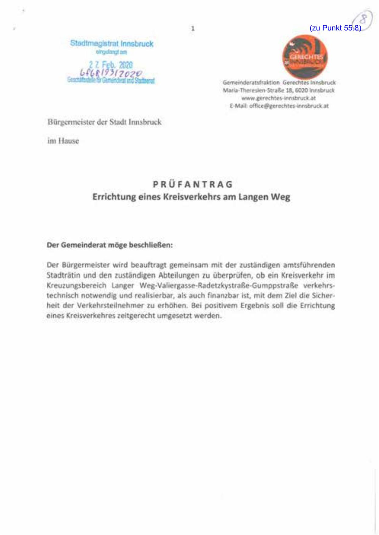 Kreuzungsbereich langer Weg-Valiergasse-Radetzkystraße-Gumppstraße verkehrstechnisch notwendig und realisierbar, als auch finanzbar ist, mit dem Ziel die Sicherheit der Verkehrsteilnehmer zu erhöhen. Bei positivem Ergebnis soll die Errichtung