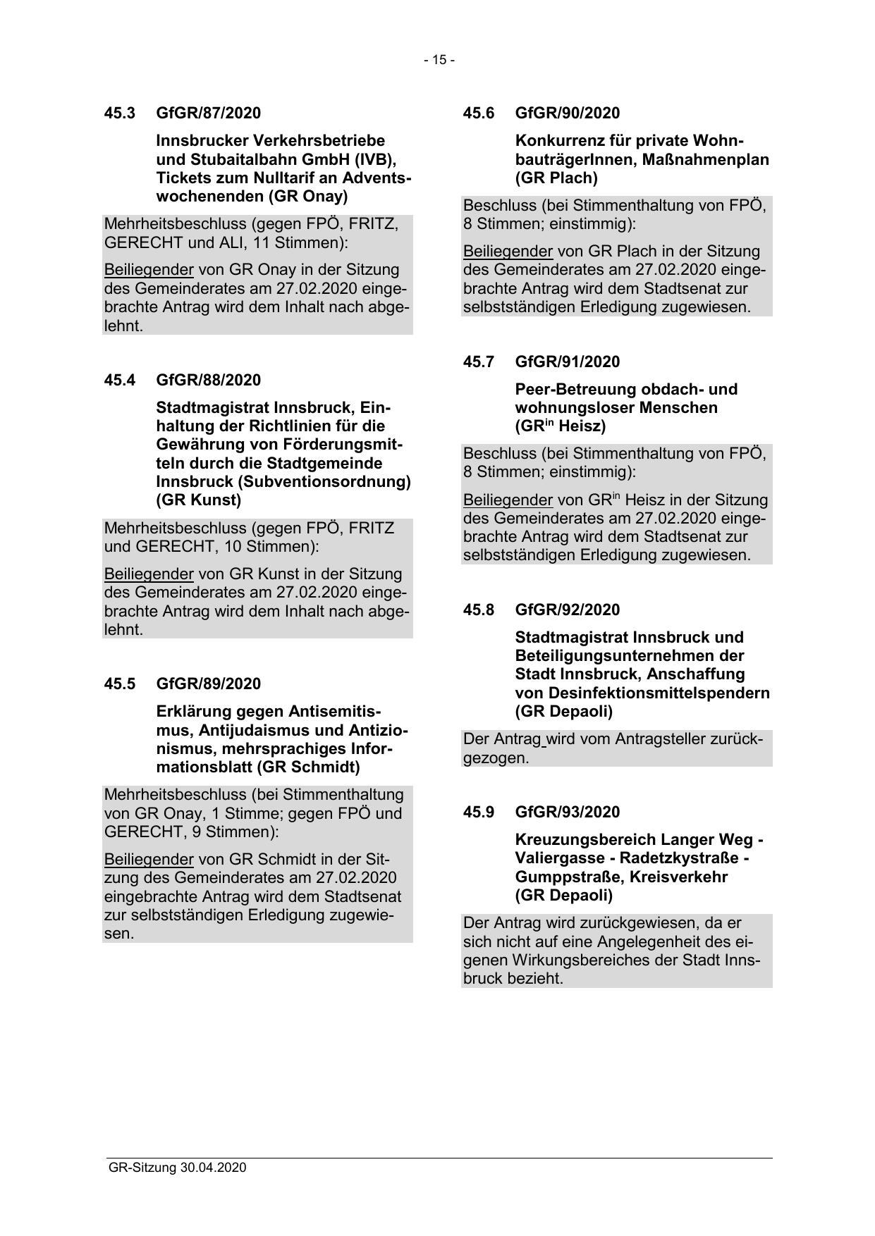 Mehrheitsbeschluss (gegen FPÖ, FRITZ,
