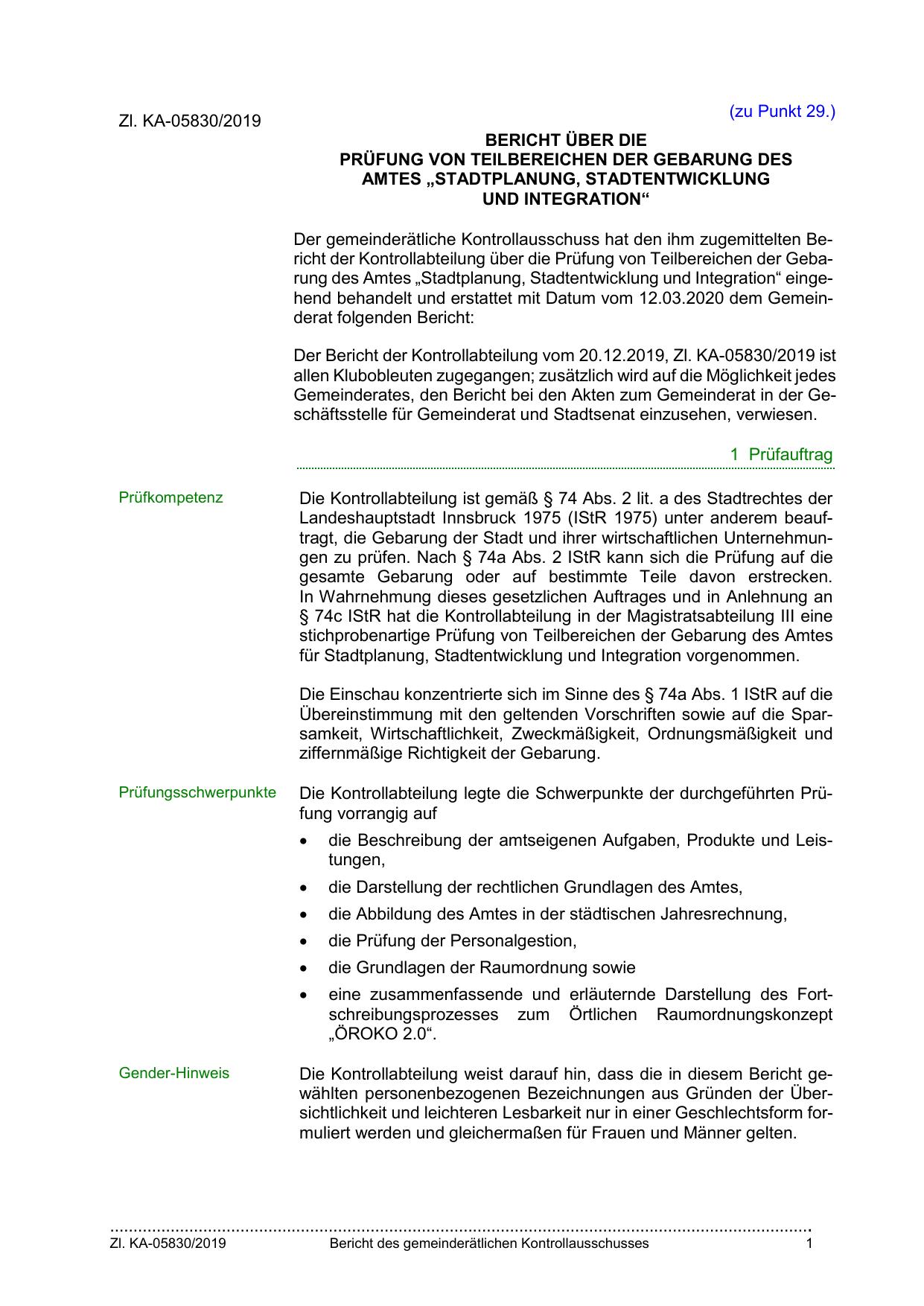 Der gemeinderätliche Kontrollausschuss hat den ihm zugemittelten Bericht der Kontrollabteilung über die Prüfung von Teilbereichen der Gebarung des Amtes „Stadtplanung, Stadtentwicklung und Integration“ eingehend behandelt und erstattet mit Datum vom 12.03.2020 dem Gemeinderat folgenden Bericht: