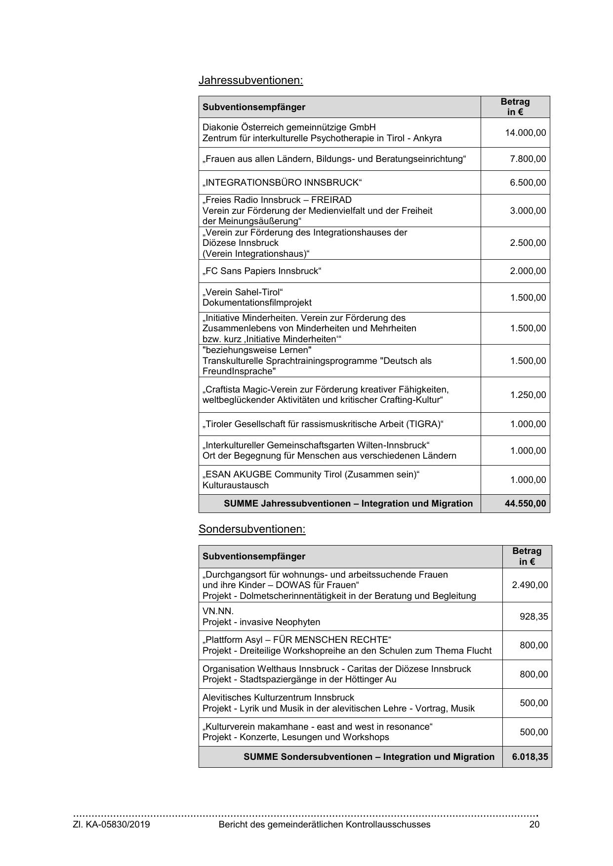 SUMME Jahressubventionen – Integration und Migration