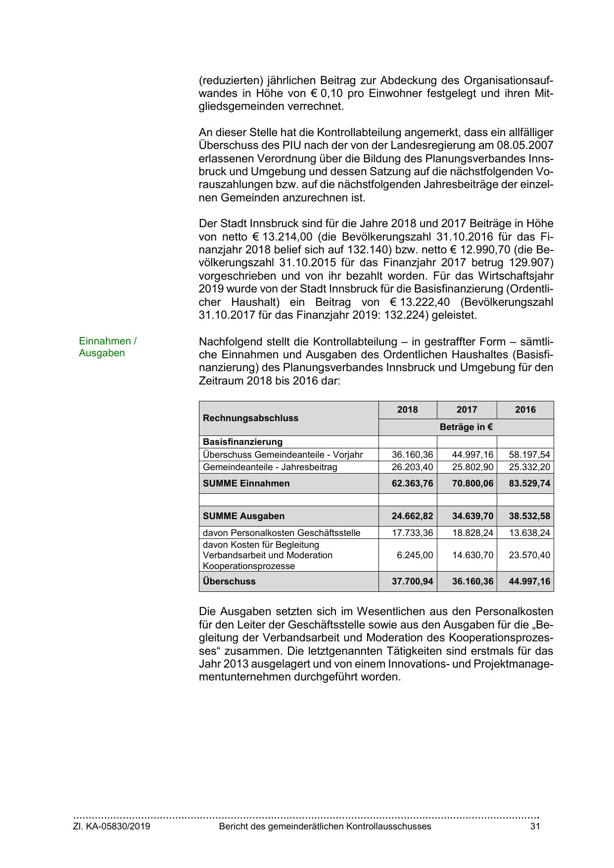 Nachfolgend stellt die Kontrollabteilung – in gestraffter Form – sämtliche Einnahmen und Ausgaben des Ordentlichen Haushaltes (Basisfinanzierung) des Planungsverbandes Innsbruck und Umgebung für den