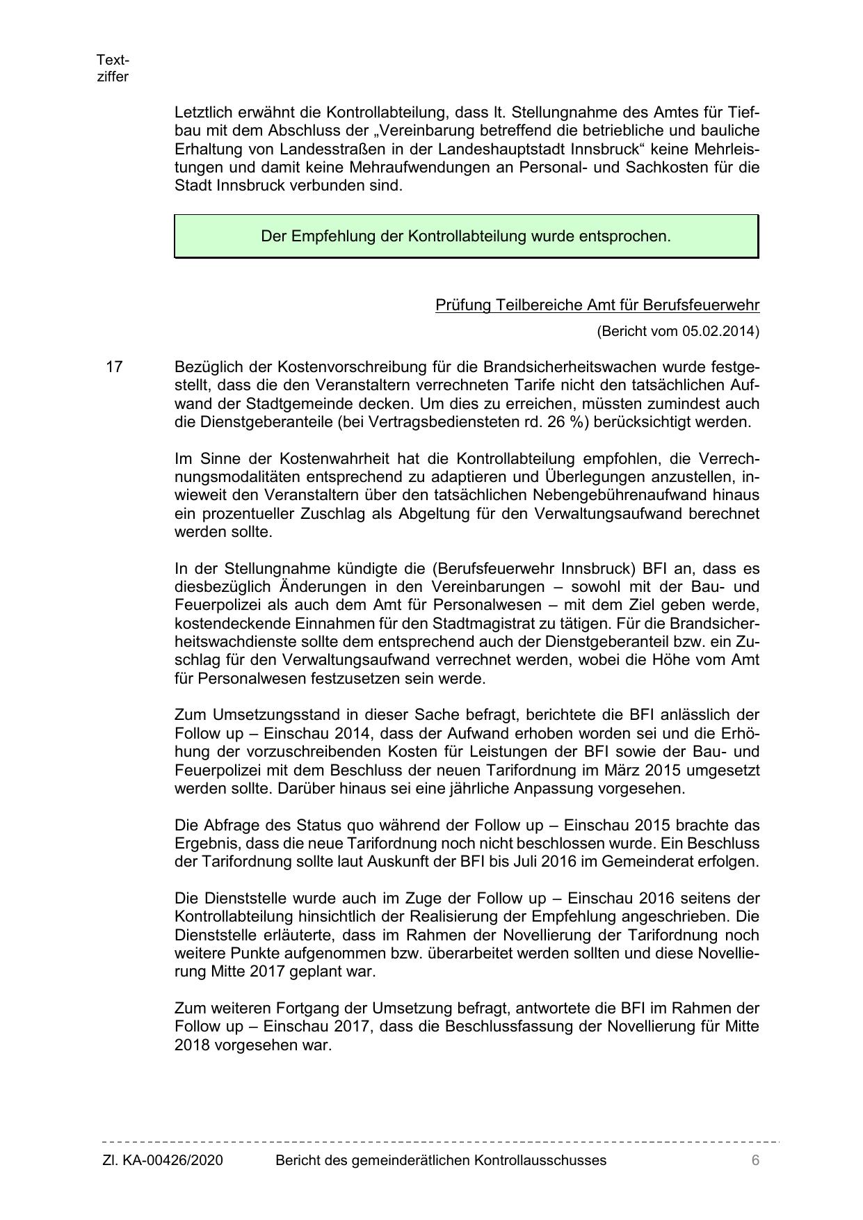 Letztlich erwähnt die Kontrollabteilung, dass lt. Stellungnahme des Amtes für Tiefbau mit dem Abschluss der „Vereinbarung betreffend die betriebliche und bauliche