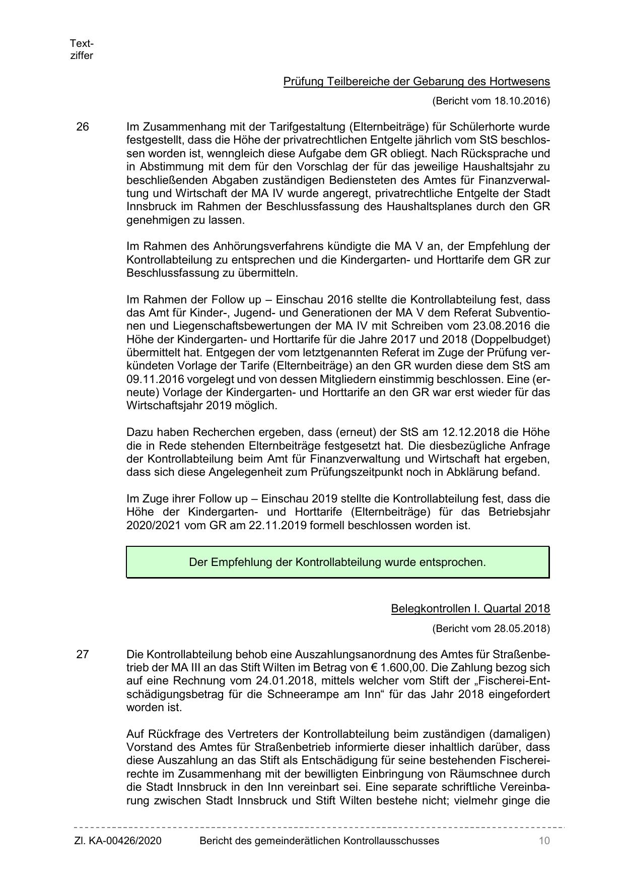 übermittelt hat. Entgegen der vom letztgenannten Referat im Zuge der Prüfung verkündeten Vorlage der Tarife (Elternbeiträge) an den GR wurden diese dem StS am