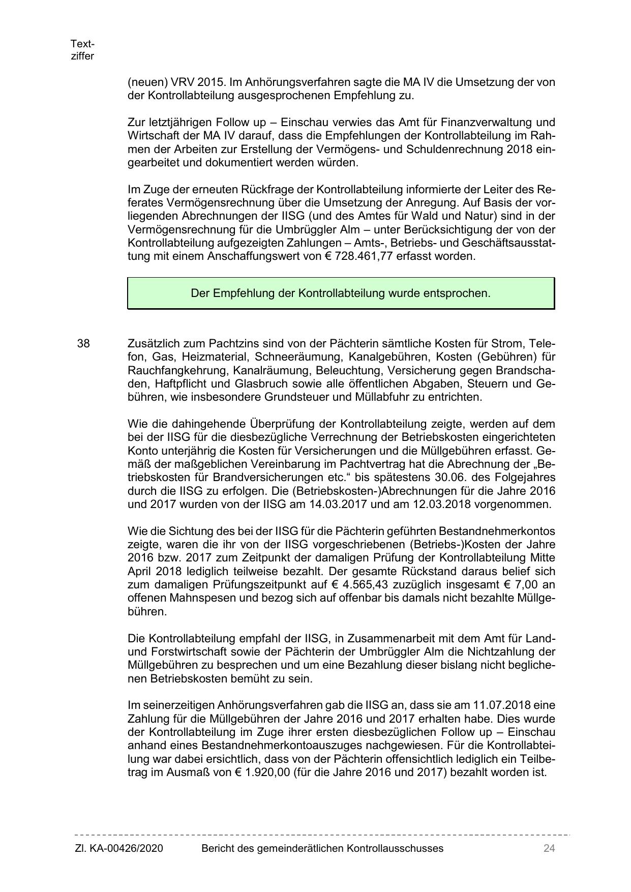 Die Kontrollabteilung empfahl der IISG, in Zusammenarbeit mit dem Amt für Landund Forstwirtschaft sowie der Pächterin der Umbrüggler Alm die Nichtzahlung der