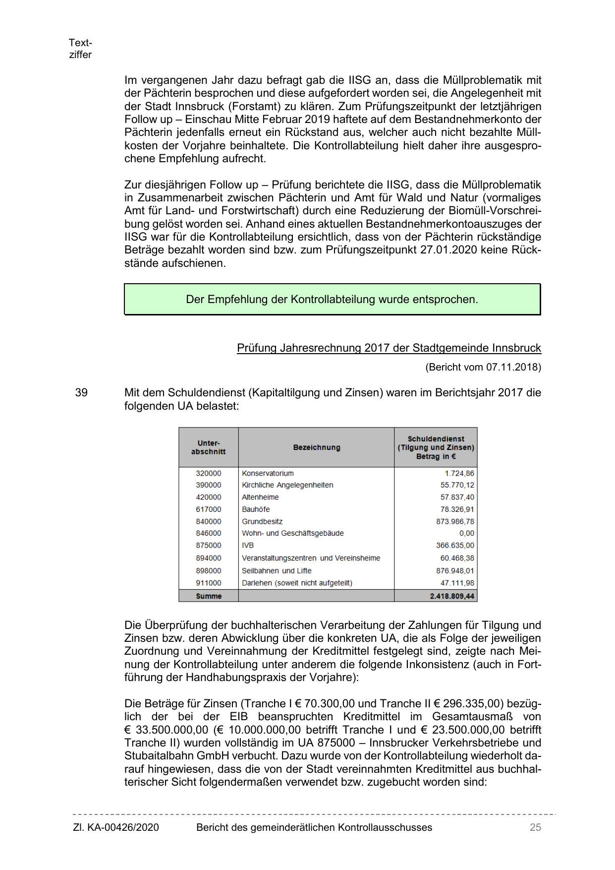 der Stadt Innsbruck (Forstamt) zu klären. Zum Prüfungszeitpunkt der letztjährigen