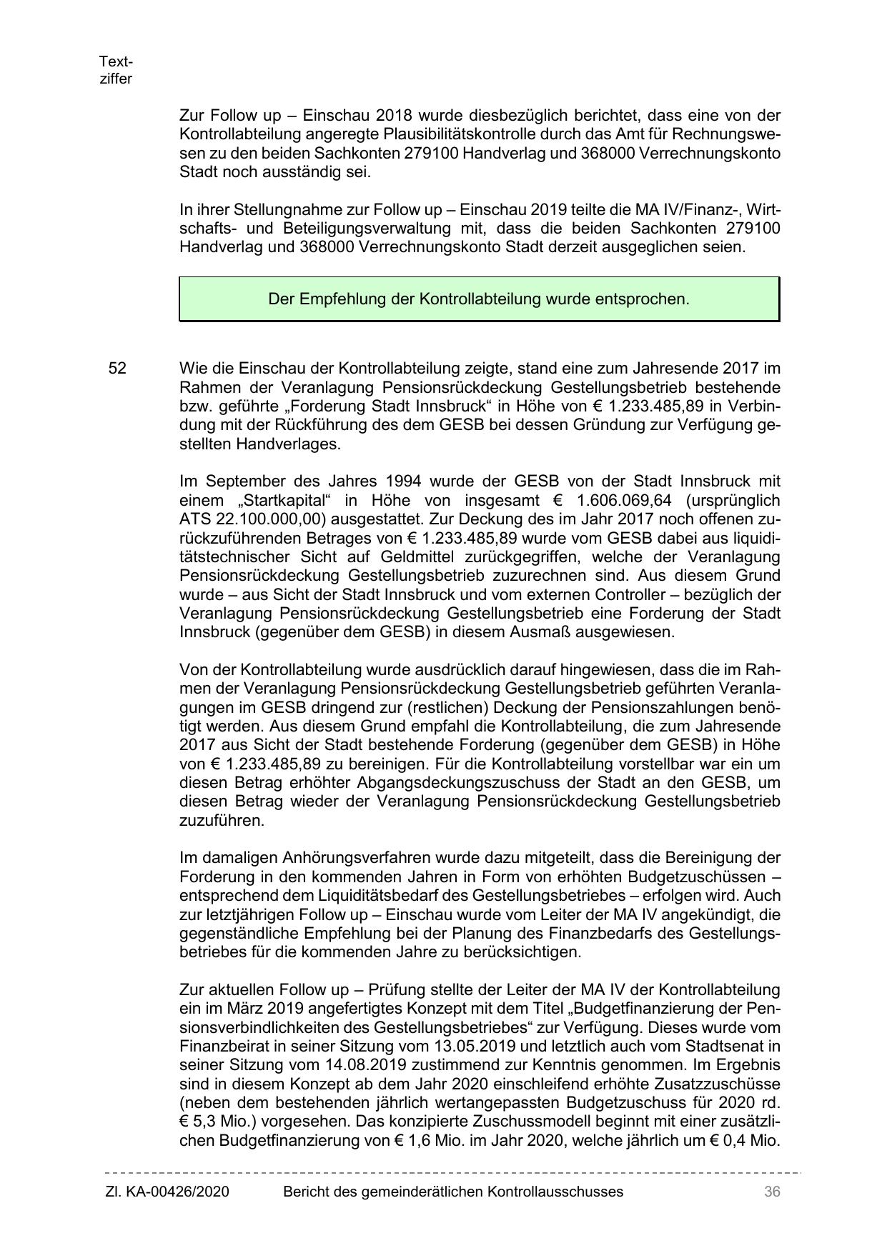 bzw. geführte „Forderung Stadt Innsbruck“ in Höhe von € 1.233.485,89 in Verbindung mit der Rückführung des dem GESB bei dessen Gründung zur Verfügung gestellten Handverlages.