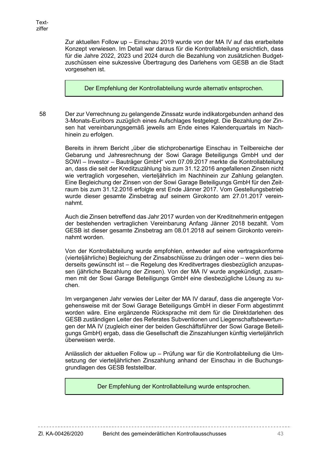 (vierteljährliche) Begleichung der Zinsabschlüsse zu drängen oder – wenn dies beiderseits gewünscht ist – die Regelung des Kreditvertrages diesbezüglich anzupassen (jährliche Bezahlung der Zinsen). Von der MA IV wurde angekündigt, zusammen mit der Sowi Garage Beteiligungs GmbH eine diesbezügliche Lösung zu suchen.