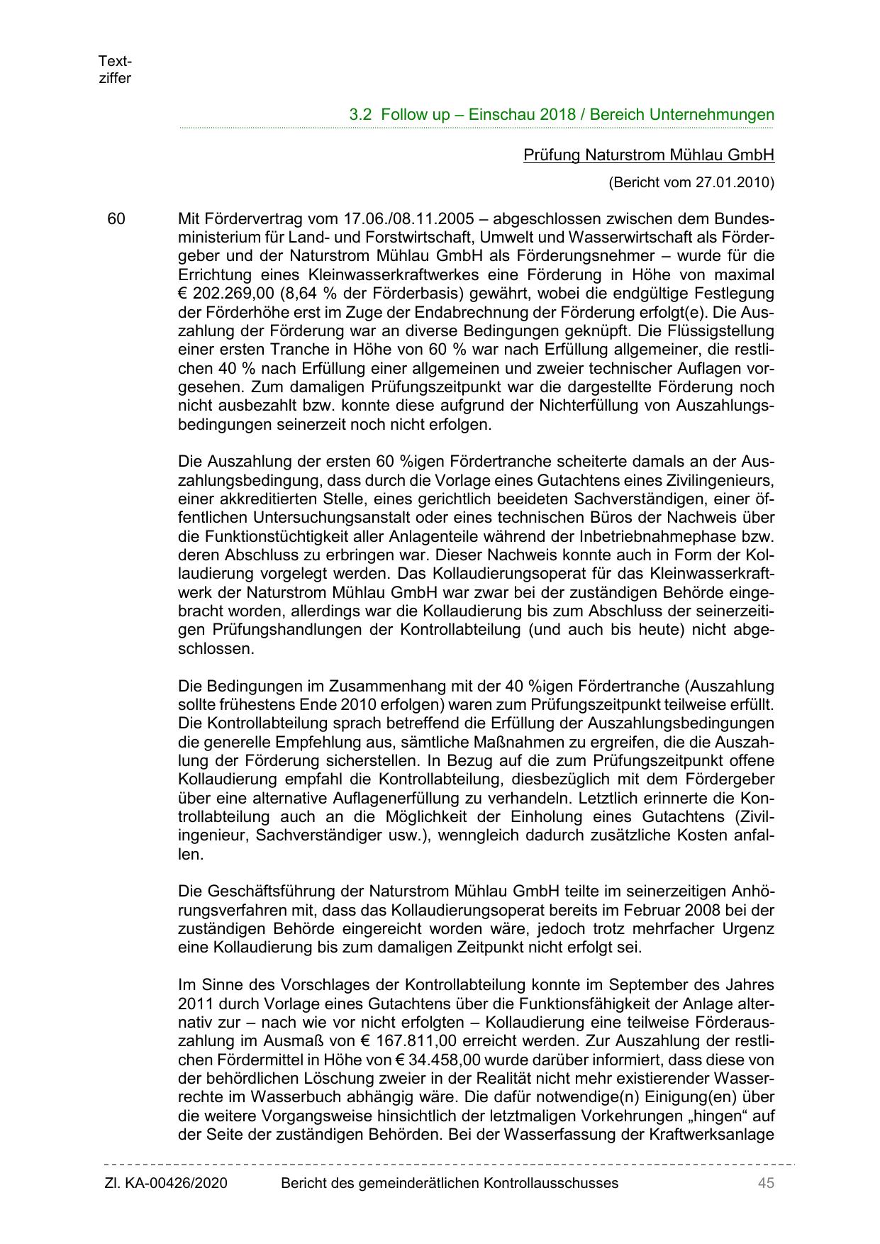 Die Auszahlung der ersten 60 %igen Fördertranche scheiterte damals an der Auszahlungsbedingung, dass durch die Vorlage eines Gutachtens eines Zivilingenieurs,