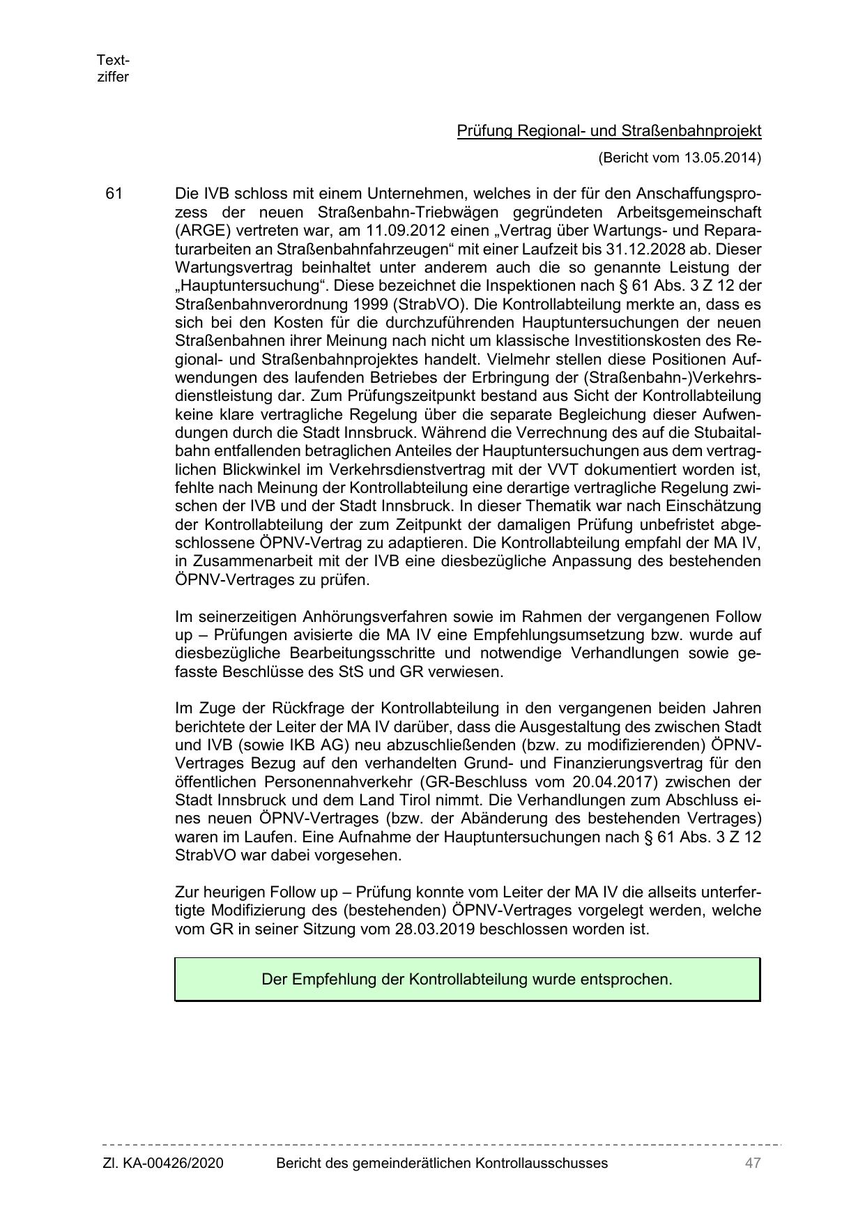 fehlte nach Meinung der Kontrollabteilung eine derartige vertragliche Regelung zwischen der IVB und der Stadt Innsbruck. In dieser Thematik war nach Einschätzung