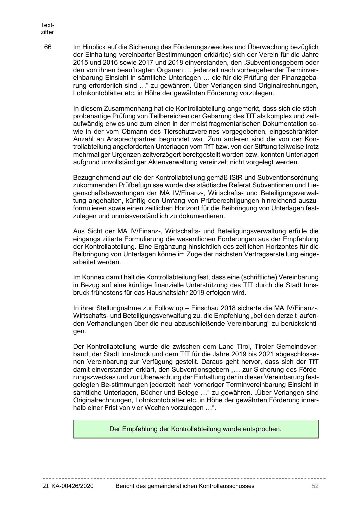 zukommenden Prüfbefugnisse wurde das städtische Referat Subventionen und Liegenschaftsbewertungen der MA IV/Finanz-, Wirtschafts- und Beteiligungsverwaltung angehalten, künftig den Umfang von Prüfberechtigungen hinreichend auszuformulieren sowie einen zeitlichen Horizont für die Beibringung von Unterlagen festzulegen und unmissverständlich zu dokumentieren.