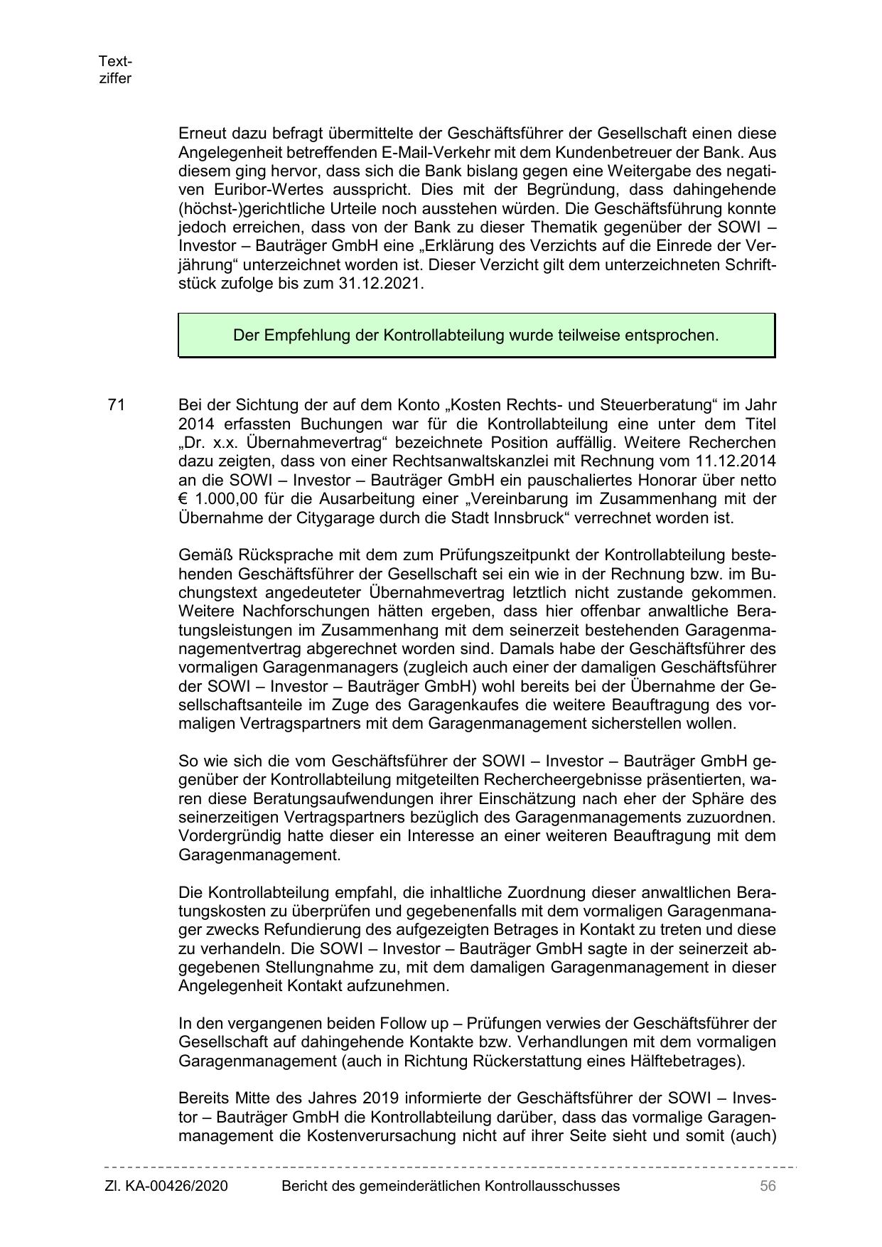 Die Kontrollabteilung empfahl, die inhaltliche Zuordnung dieser anwaltlichen Beratungskosten zu überprüfen und gegebenenfalls mit dem vormaligen Garagenmanager zwecks Refundierung des aufgezeigten Betrages in Kontakt zu treten und diese