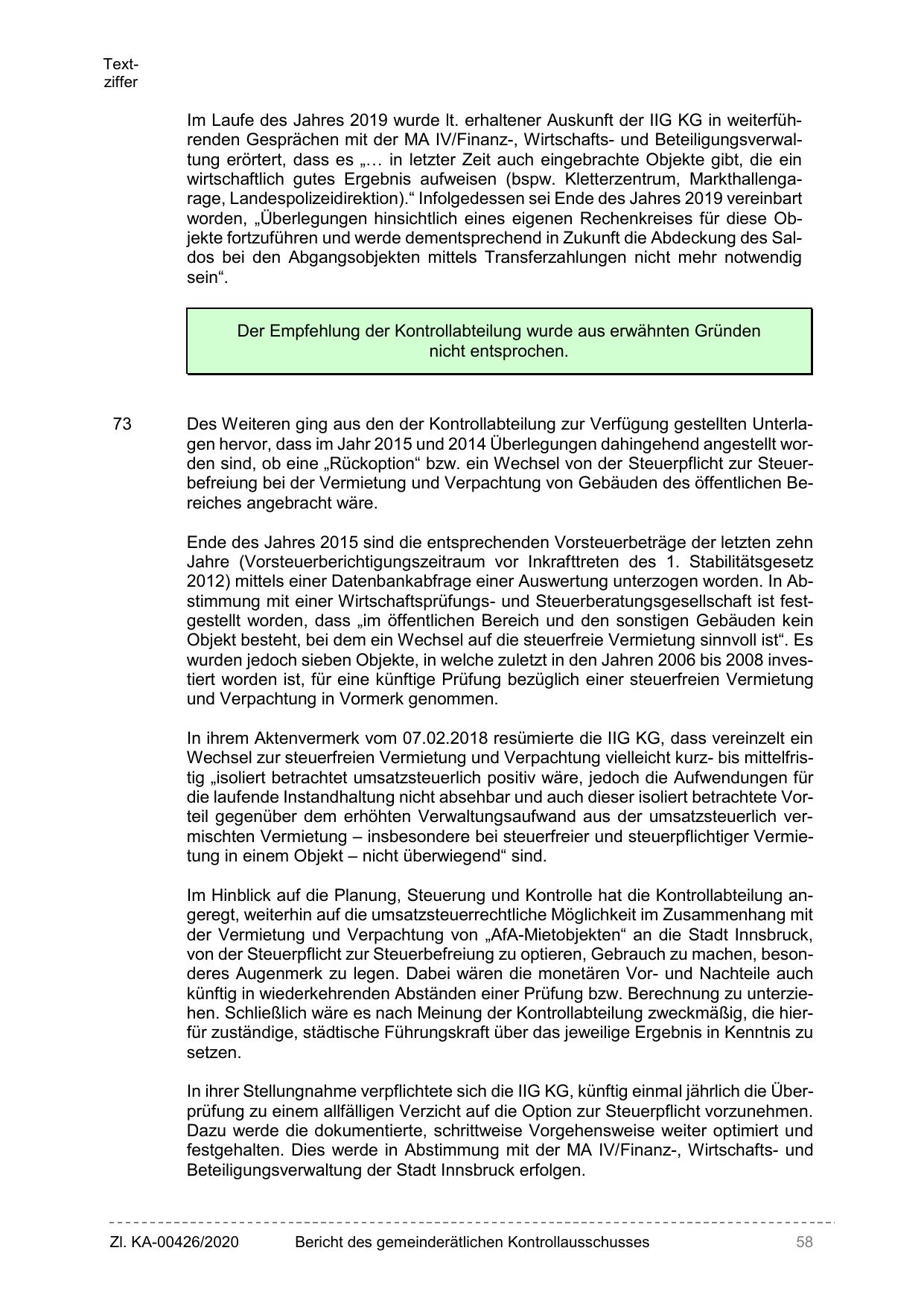 In ihrer Stellungnahme verpflichtete sich die IIG KG, künftig einmal jährlich die Überprüfung zu einem allfälligen Verzicht auf die Option zur Steuerpflicht vorzunehmen.