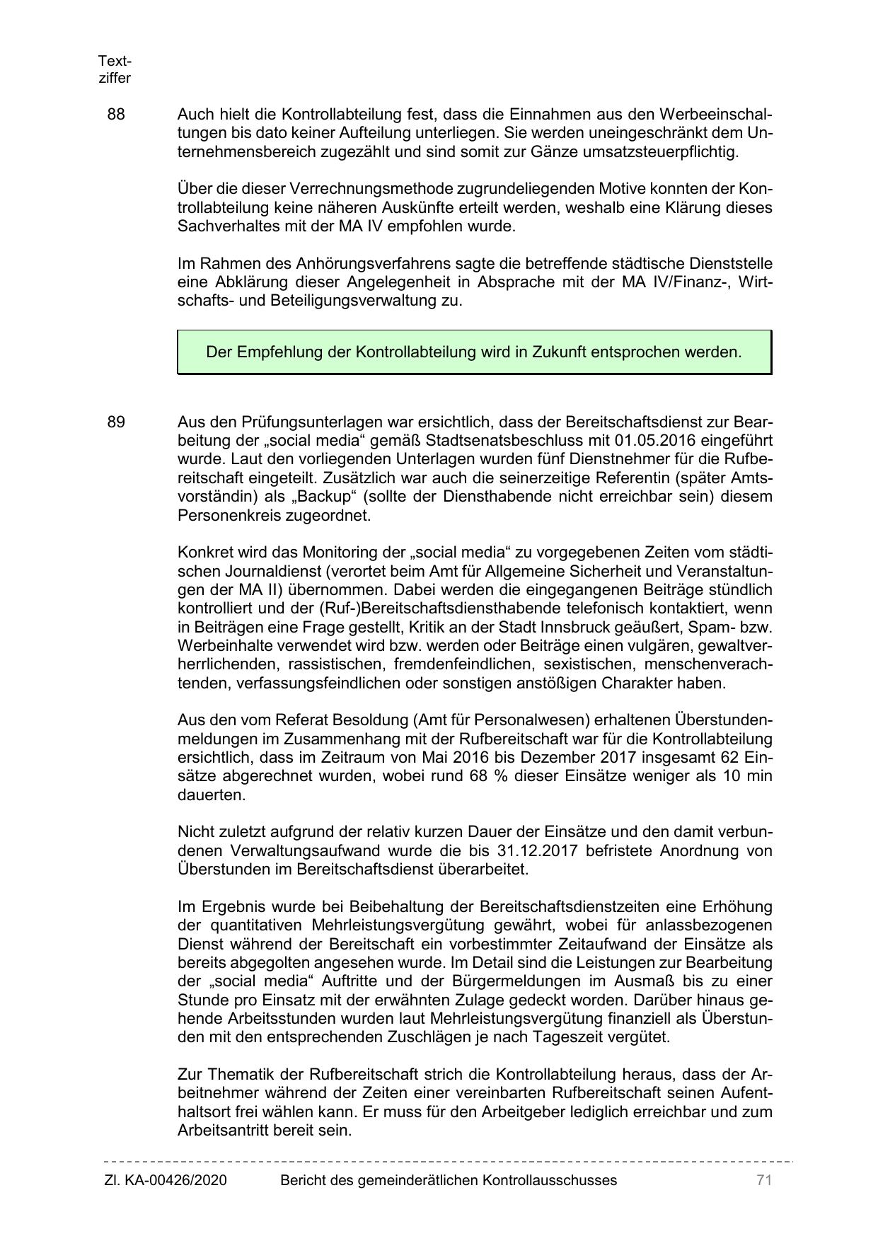 Aus den Prüfungsunterlagen war ersichtlich, dass der Bereitschaftsdienst zur Bearbeitung der „social media“ gemäß Stadtsenatsbeschluss mit 01.05.2016 eingeführt