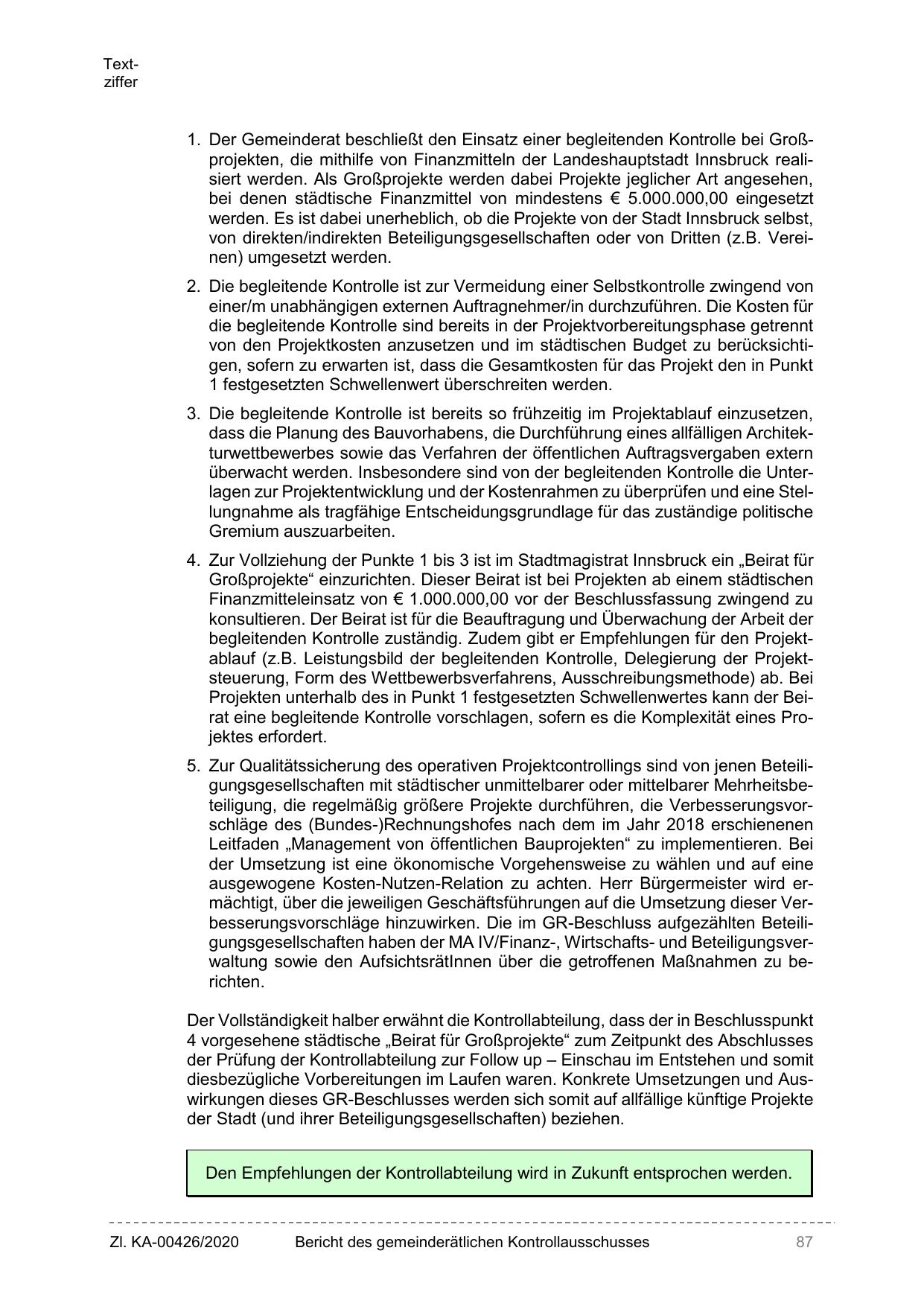 1. Der Gemeinderat beschließt den Einsatz einer begleitenden Kontrolle bei Großprojekten, die mithilfe von Finanzmitteln der Landeshauptstadt Innsbruck realisiert werden. Als Großprojekte werden dabei Projekte jeglicher Art angesehen,
