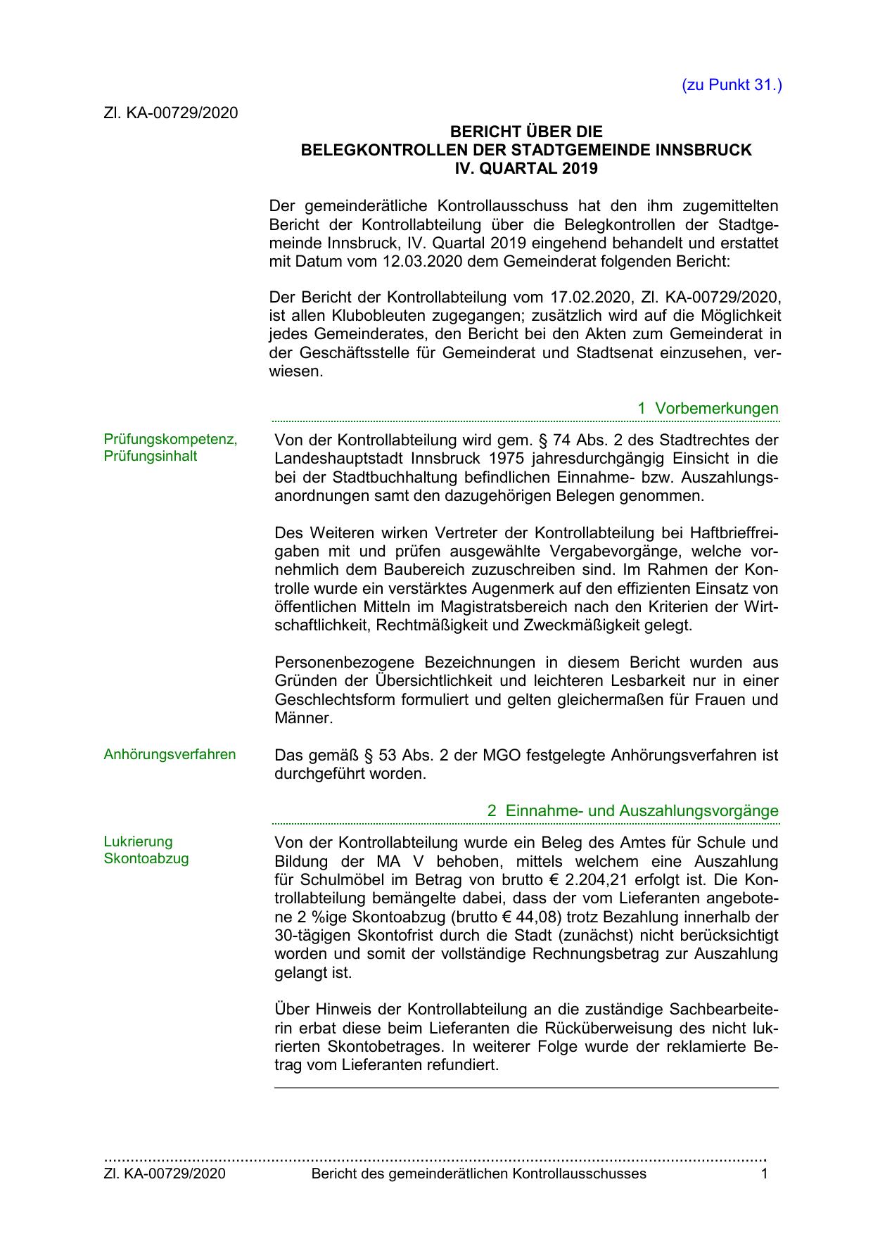 Bericht der Kontrollabteilung über die Belegkontrollen der Stadtgemeinde Innsbruck, IV. Quartal 2019 eingehend behandelt und erstattet