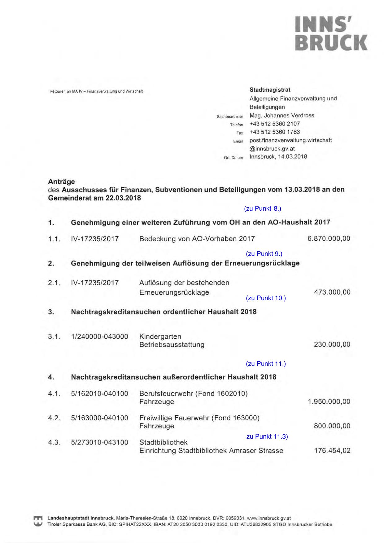 Nachtragskreditansuchen außerordentlicher Haushalt 2018