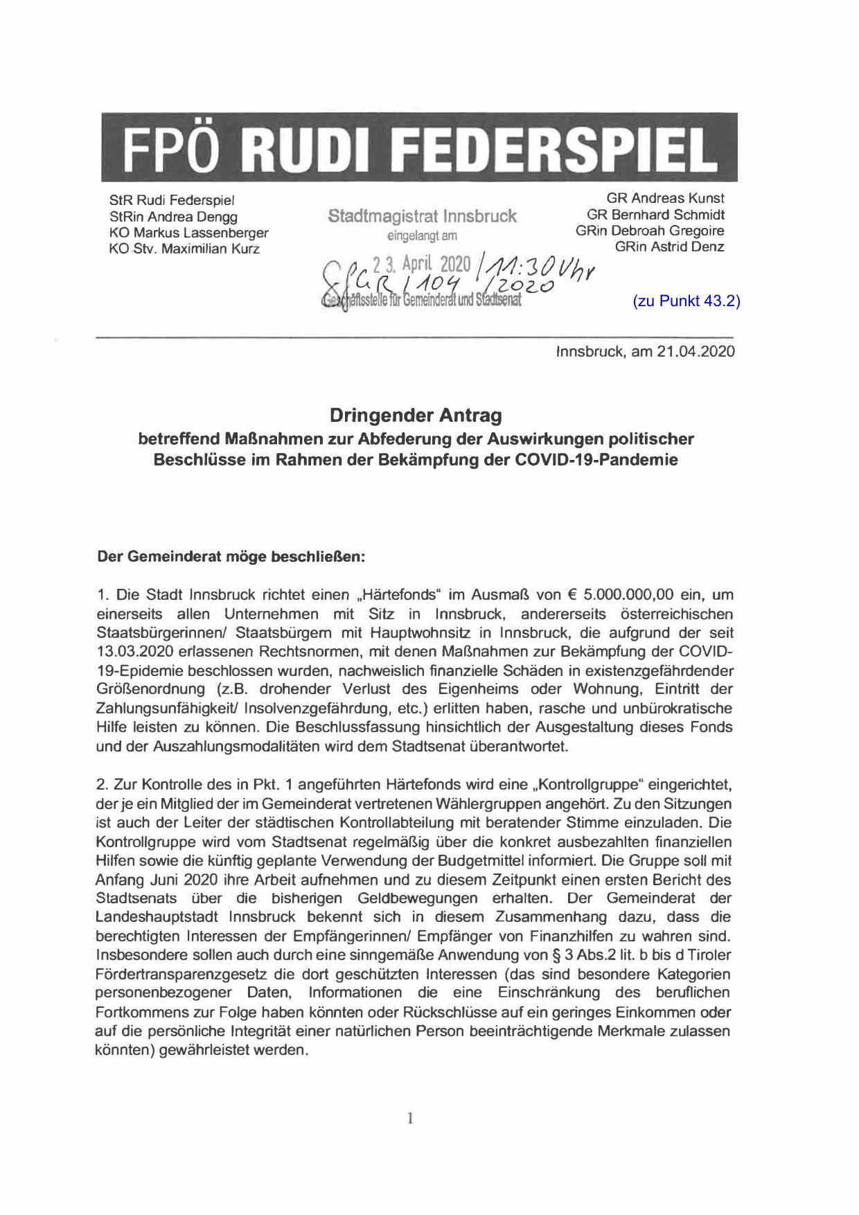 1. Die Stadt Innsbruck richtet einen „Härtefonds" im Ausmaß von € 5.000.000,00 ein, um