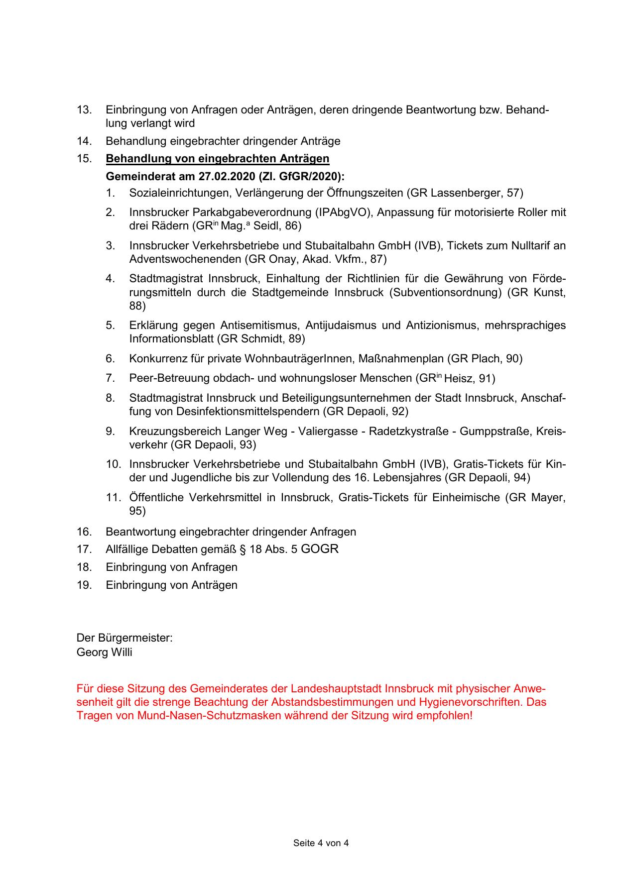 Für diese Sitzung des Gemeinderates der Landeshauptstadt Innsbruck mit physischer Anwesenheit gilt die strenge Beachtung der Abstandsbestimmungen und Hygienevorschriften. Das