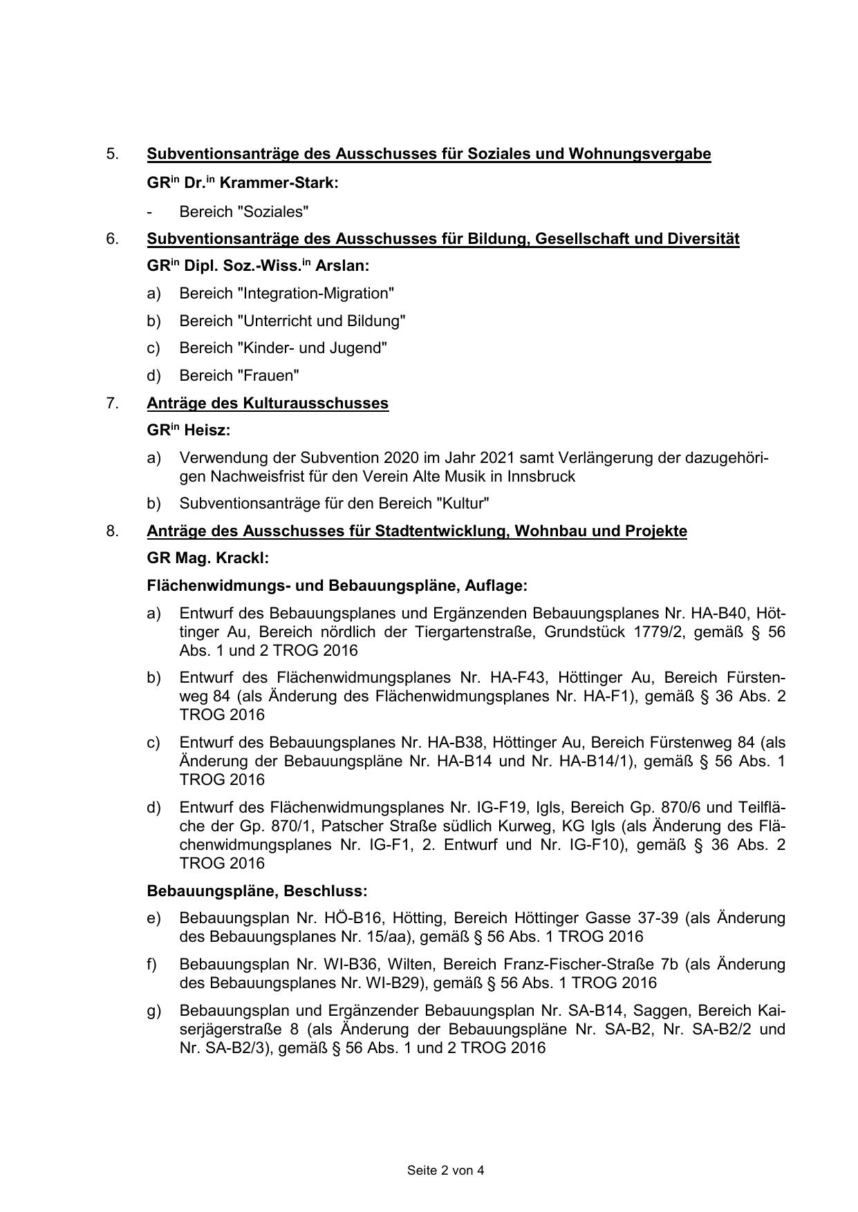 Anträge des Ausschusses für Stadtentwicklung, Wohnbau und Projekte