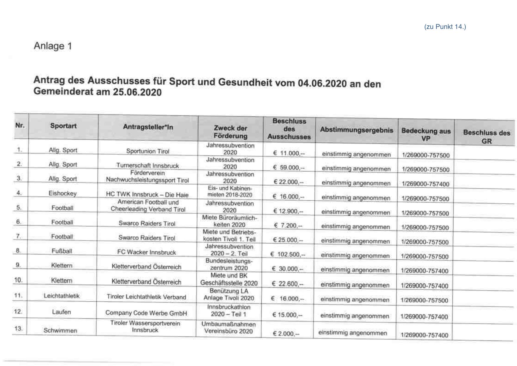 Antrag des Ausschusses für Sport und Gesundheit vom 04.06.2020 an den