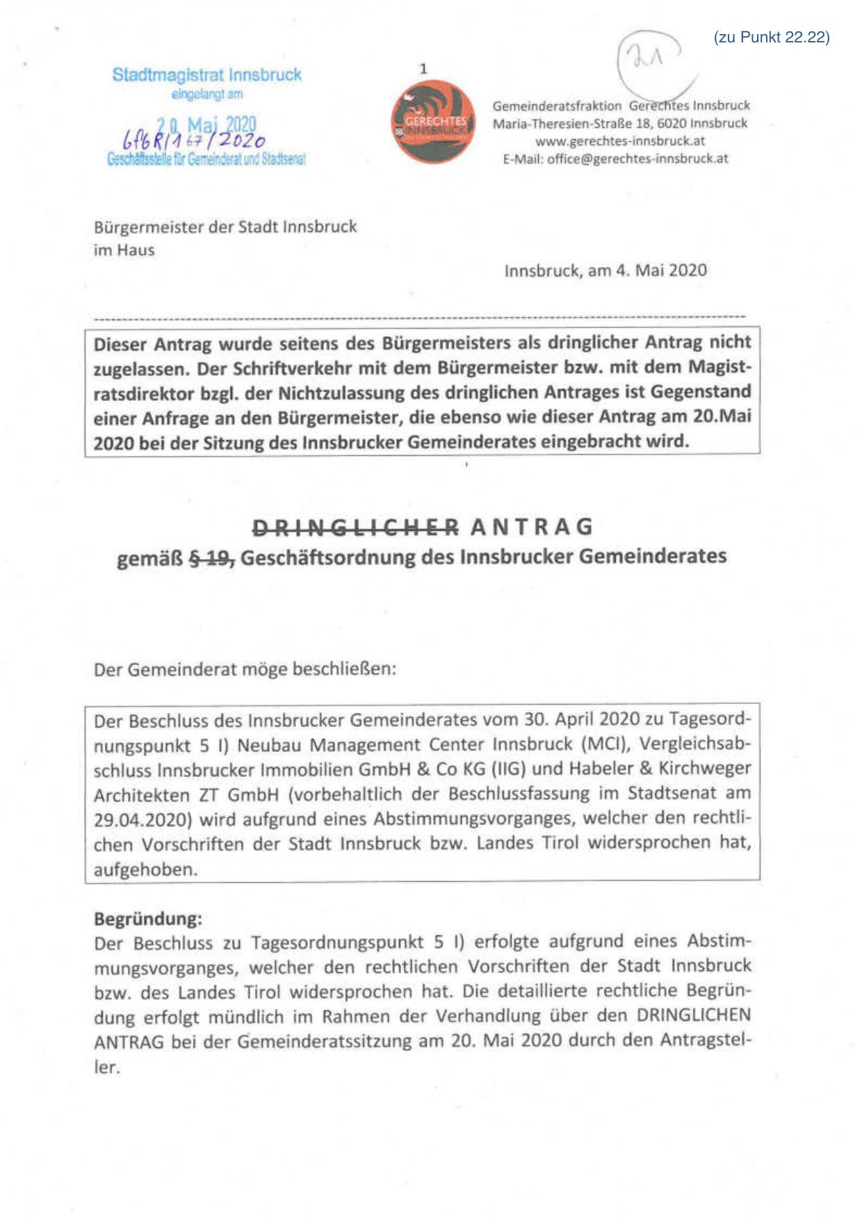 29.04. 2020) wird aufgrund eines Abstimmungsvorganges, welcher den rechtlichen Vorschriften der Stadt Innsbruck bzw. Landes Tirol widersprochen hat,