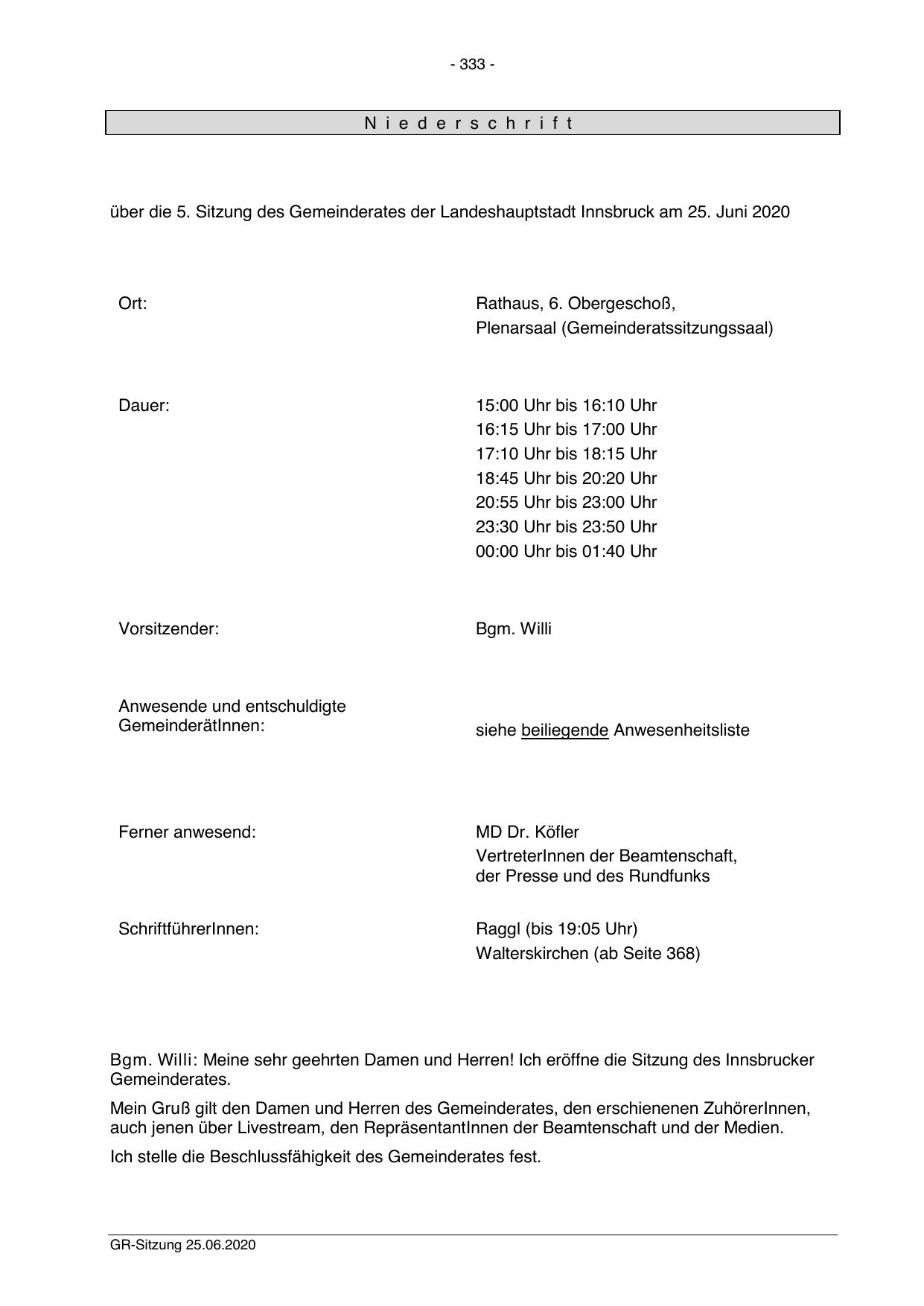 über die 5. Sitzung des Gemeinderates der Landeshauptstadt Innsbruck am 25. Juni 2020
