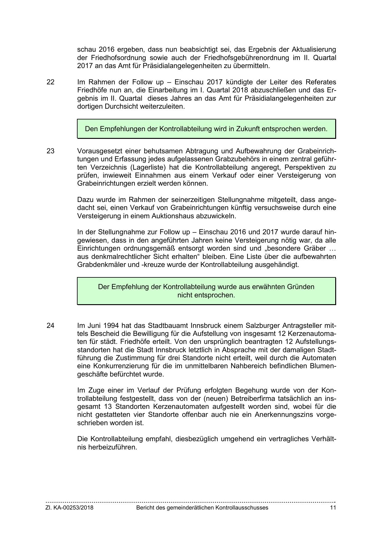 Dazu wurde im Rahmen der seinerzeitigen Stellungnahme mitgeteilt, dass angedacht sei, einen Verkauf von Grabeinrichtungen künftig versuchsweise durch eine