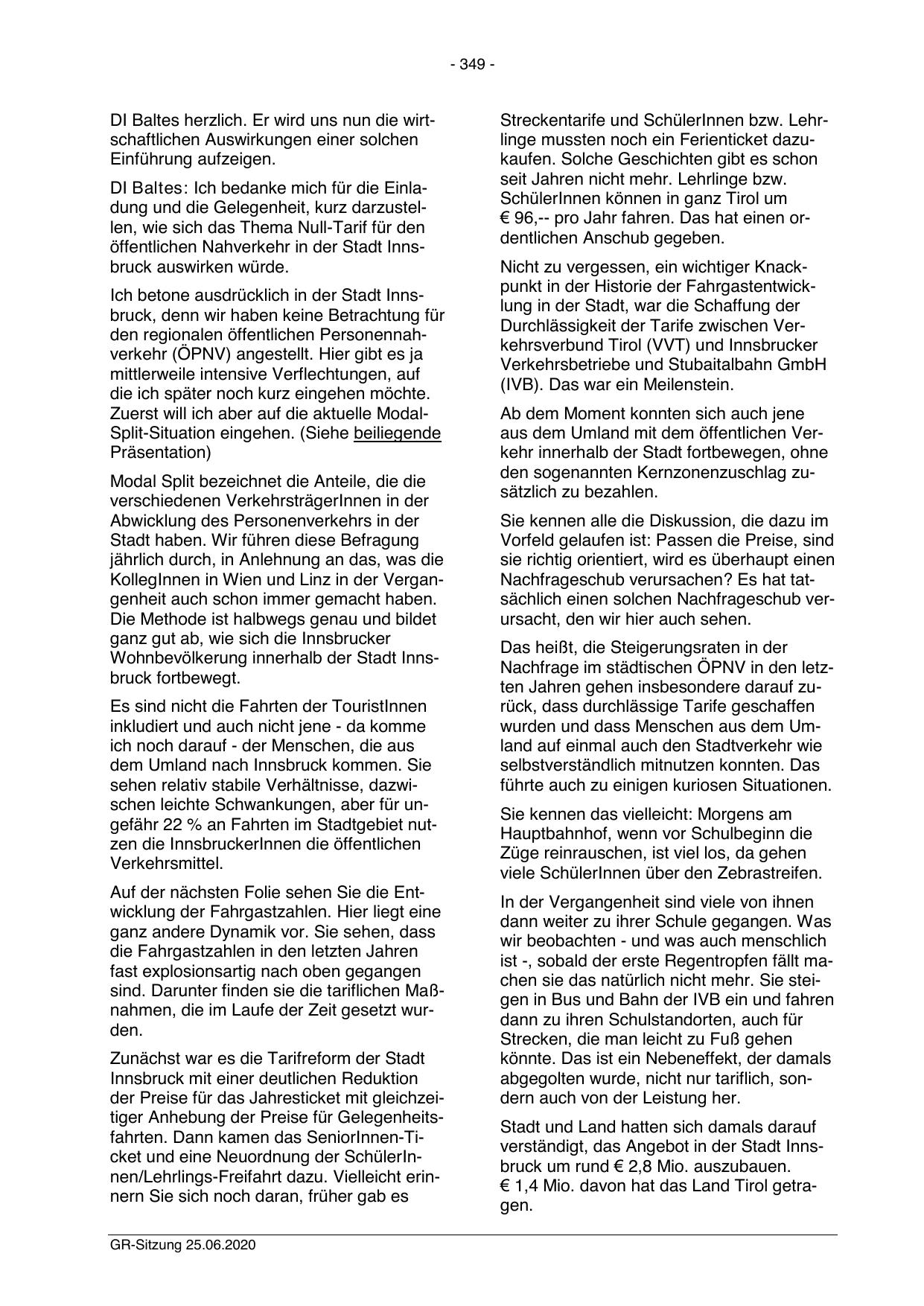 DI Baltes: Ich bedanke mich für die Einladung und die Gelegenheit, kurz darzustellen, wie sich das Thema Null-Tarif für den