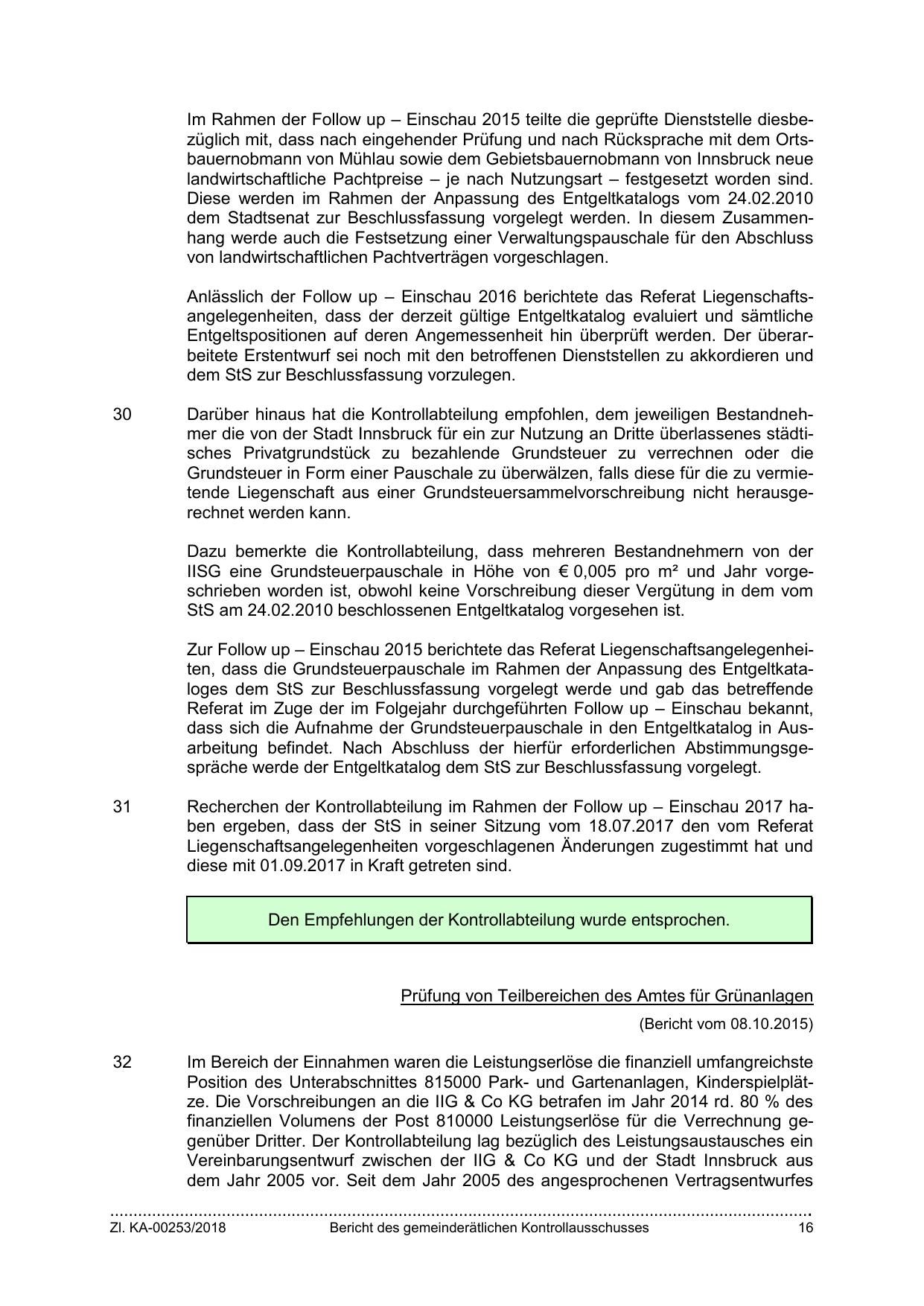 Zur Follow up – Einschau 2015 berichtete das Referat Liegenschaftsangelegenheiten, dass die Grundsteuerpauschale im Rahmen der Anpassung des Entgeltkataloges dem StS zur Beschlussfassung vorgelegt werde und gab das betreffende