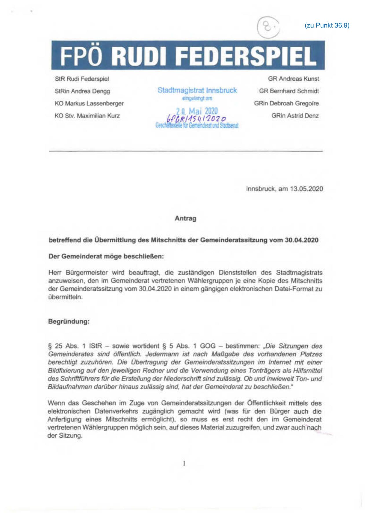 betreffend die Übermittlung des Mitschnitts der Gemeinderatssitzung vom 30.04.2020