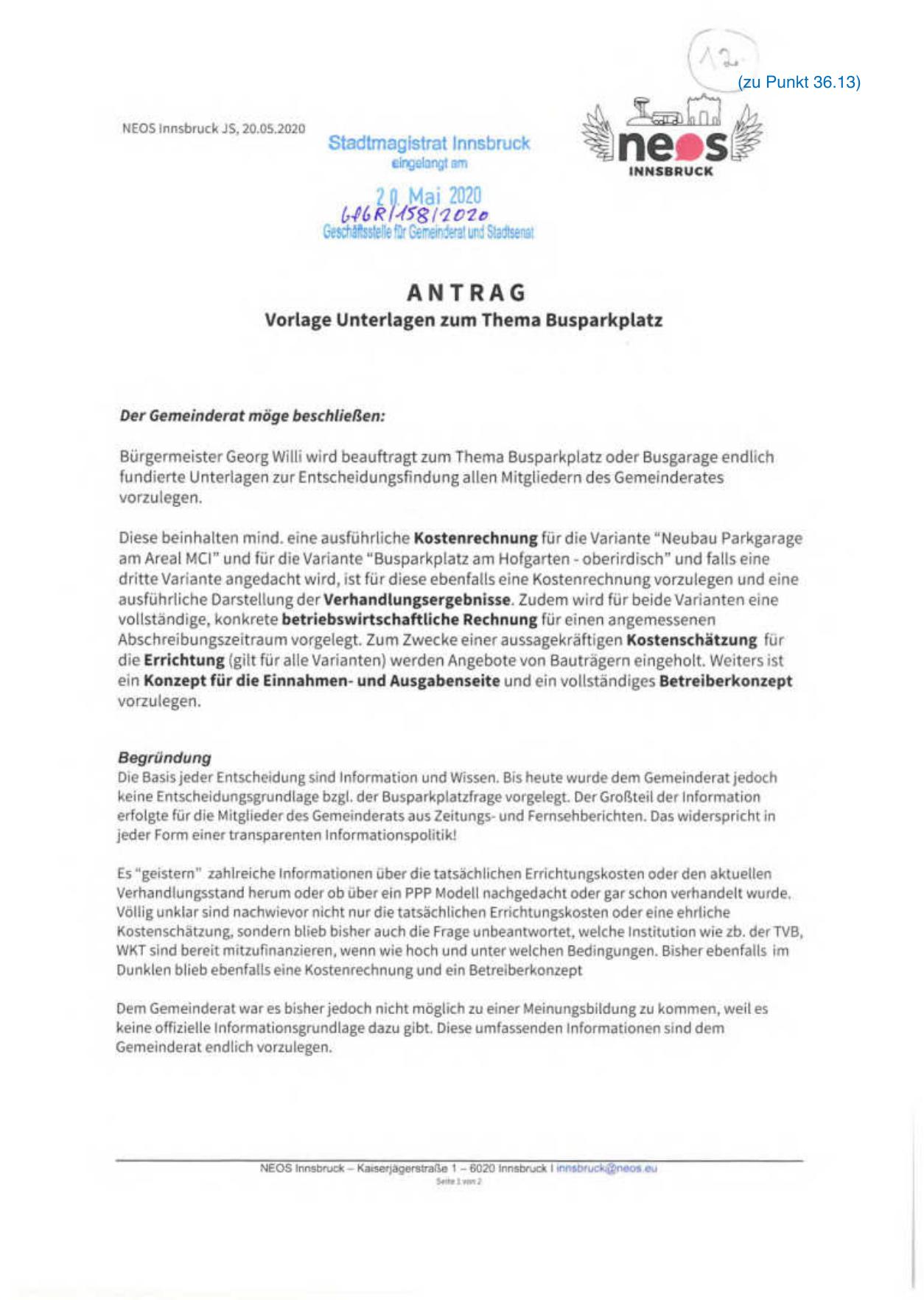 Bü rgermeister Georg Willi wird beauftragt zum Thema Busparkplatz oder Busgarage endlich