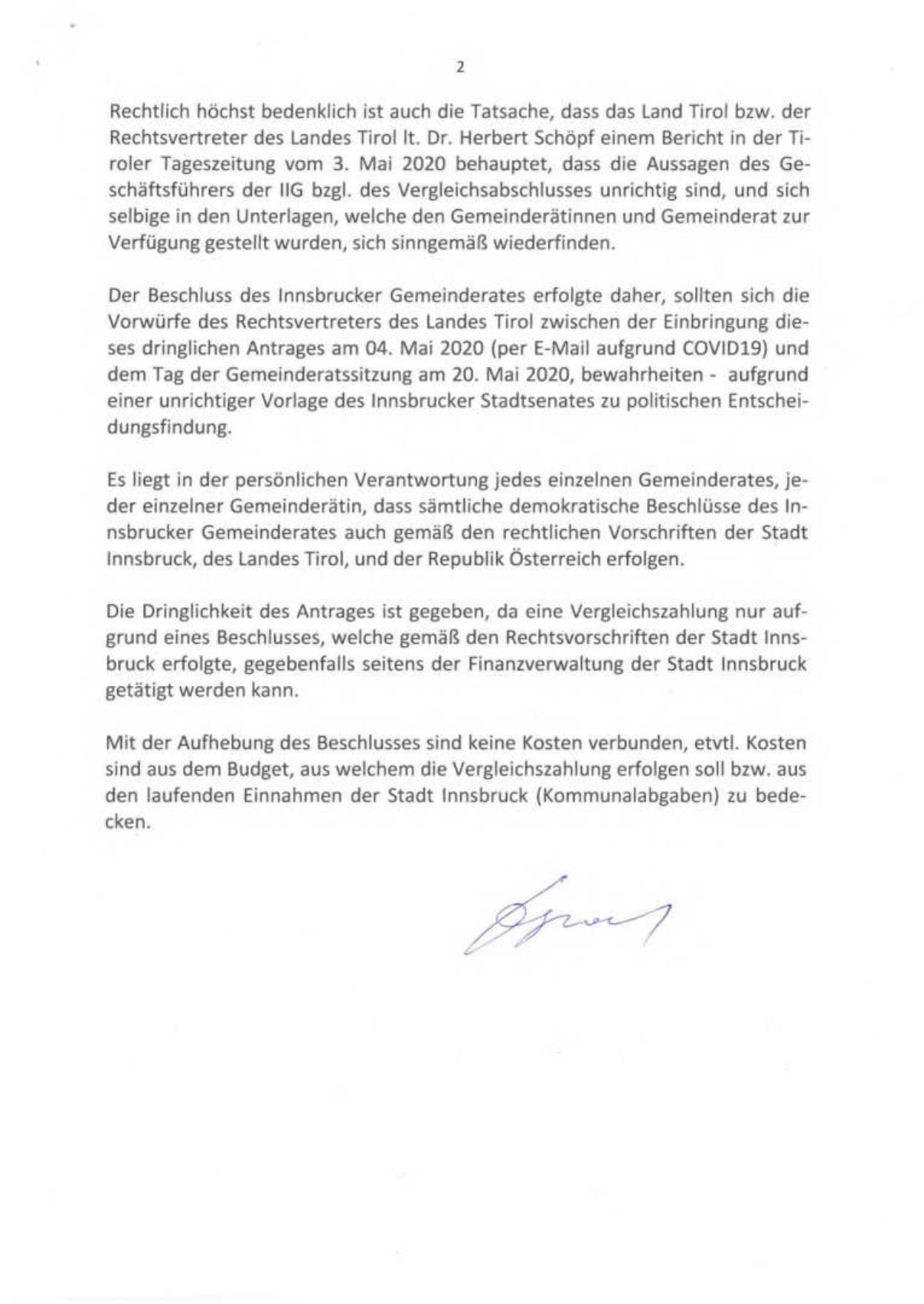 Die Dringlichkeit des Antrages ist gegeben, da eine Vergleichszahlung nur aufgrund eines Beschlusses, welche gemäß den Rechtsvorschriften der Stadt Innsbruck erfolgte, gegebenfalls seitens der Finanzverwaltung der Stadt Innsbruck