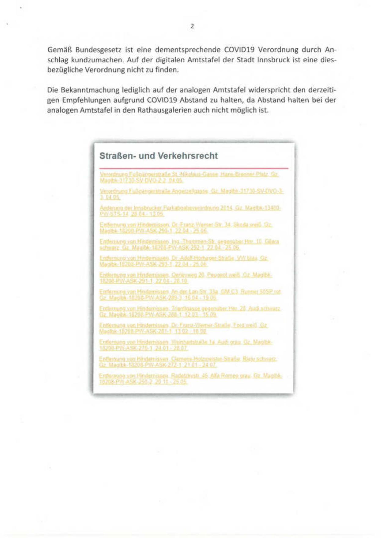 Gem äß Bundesgesetz ist eine dementsprechende C0VID19 Verordnung durch Anschlag kundzumachen. Auf der digitalen Amtstafel der Stadt Innsbruck ist eine diesbez ügliche Verordnung nicht zu finden.