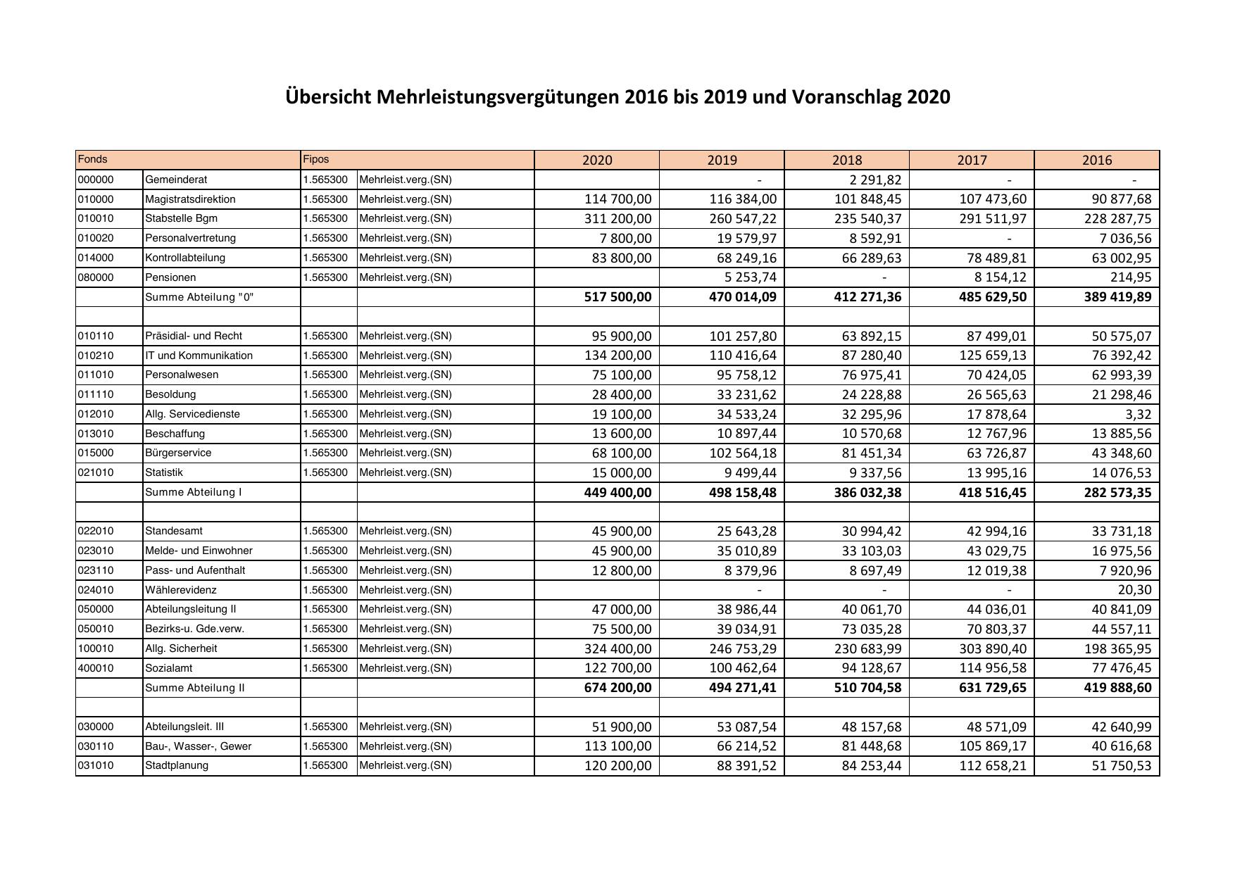 Übersicht Mehrleistungsvergütungen 2016 bis 2019 und Voranschlag 2020