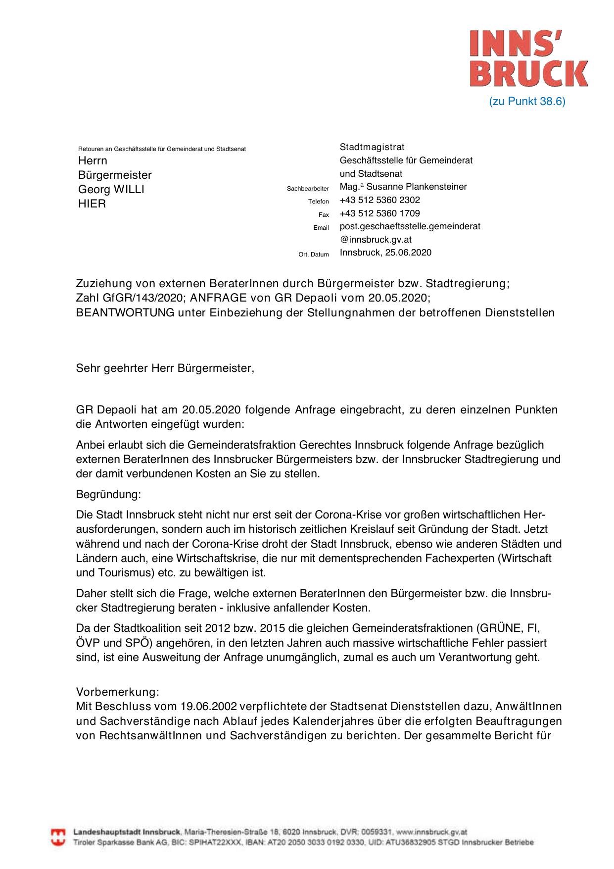 Zahl GfGR/143/2020; ANFRAGE von GR Depaoli vom 20.05.2020;