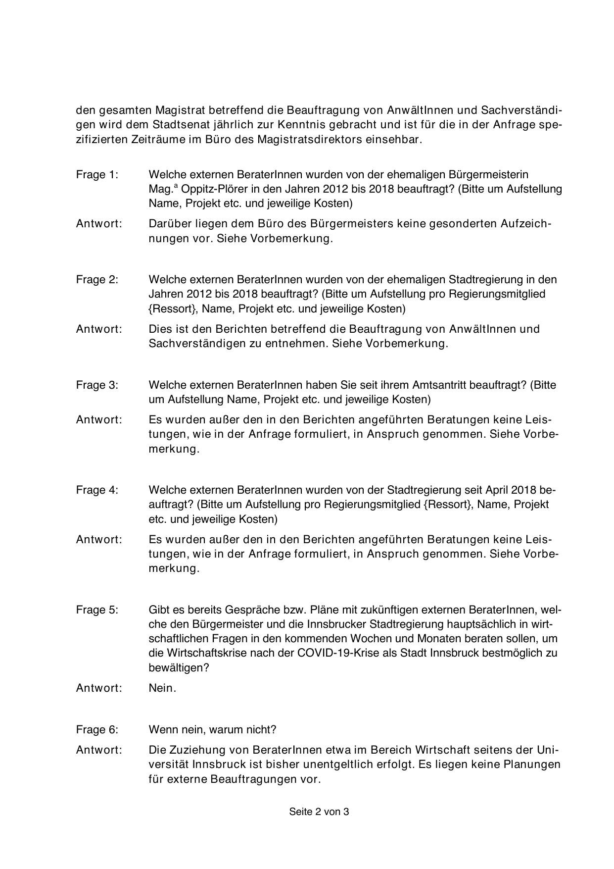 Gibt es bereits Gespräche bzw. Pläne mit zukünftigen externen BeraterInnen, welche den Bürgermeister und die Innsbrucker Stadtregierung hauptsächlich in wirtschaftlichen Fragen in den kommenden Wochen und Monaten beraten sollen, um
