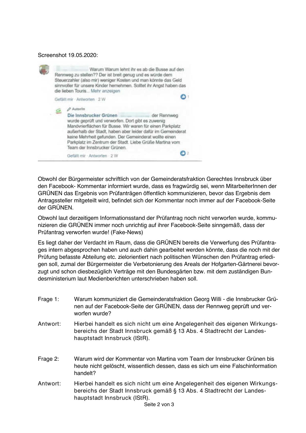 Warum kommuniziert die Gemeinderatsfraktion Georg Willi - die Innsbrucker Grünen auf der Facebook-Seite der GRÜNEN, dass der Rennweg geprüft und verworfen wurde?